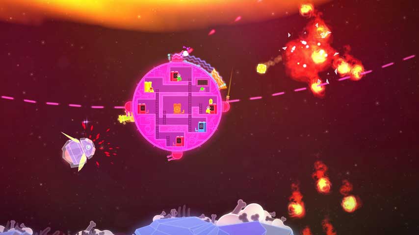 If you don't have a friend readily available for couch co-op, there's the AI pet space-cat or space-dog which can help you out in solo mode. You can command these helpful critters to man the various stations inside the ship while you fly it.