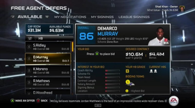 As usual, Madden is full of these niggling little issues, and they have a way of piling up after a while. The blocking is good, for example, but every once in a while the AI linemen will let a pass rusher go through untouched for seemingly no reason and yield a crushing sack. Attempts to streamline game intros by removing the coin toss—now selectable in the team setup screen—are foiled by the fact that you can't skip large chunks of the intro and halftime, nor even challenges. The playcalling, as much as I like it, can be a chore to navigate if you're looking for something specific. And of course, Owner Mode is still terrible, with the sole reason for using it being to fullfill Jacksonville's destiny and relocate them to Dublin. I could spend the rest of the review explaining why it's really bad, but suffice it to say that the navigation is almost unusable and funds earned selling t-shirts are virtually worthless.