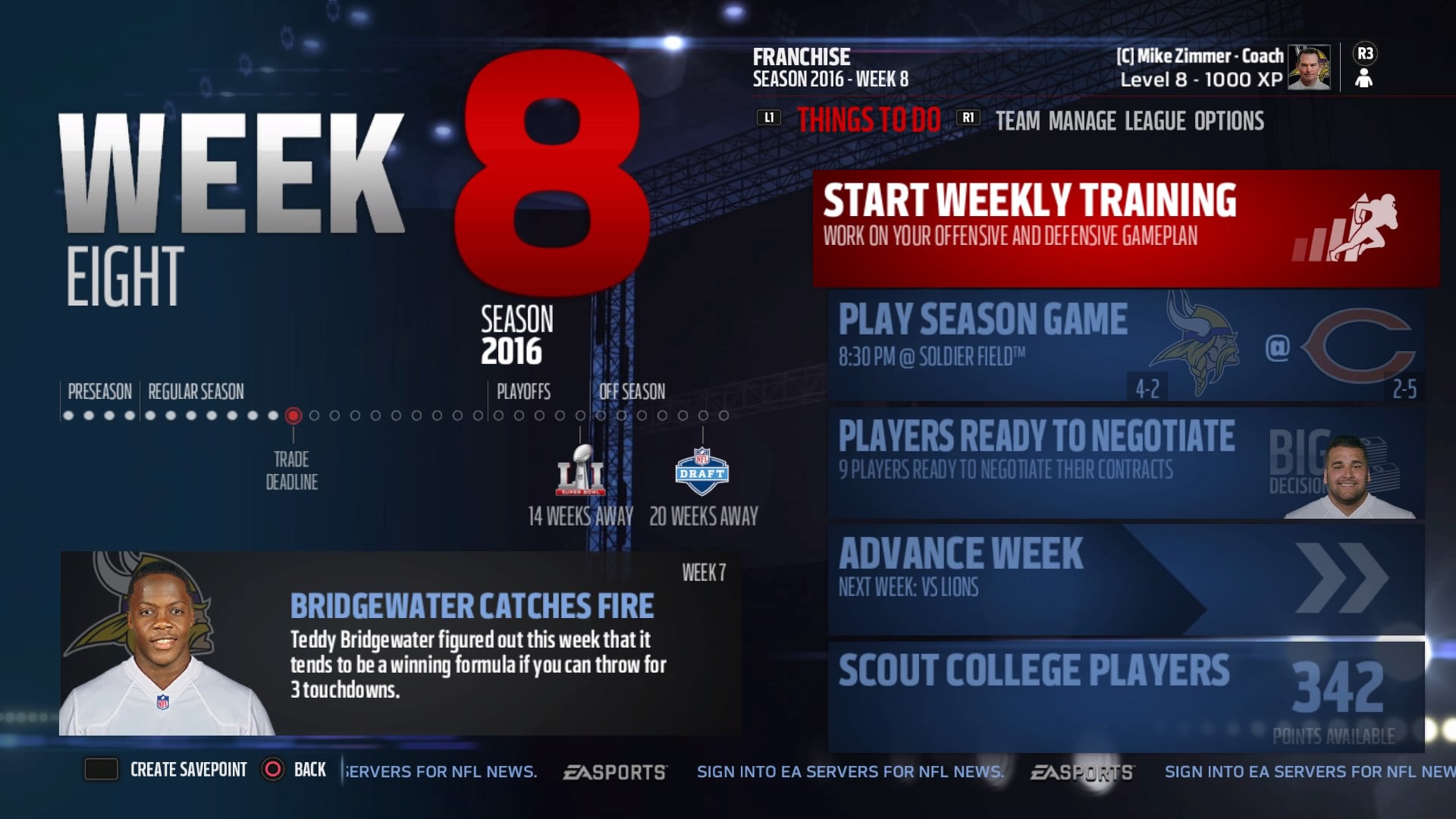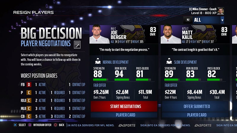 As franchise modes go, Madden continues to sit somewhere in the middle, neither falling as far as NHL nor rising as high as NBA 2K. Its main drawbacks are that it features none of the emergent storytelling found in FIFA or NBA 2K, that owner mode is only good for moving your team, and that there's not a lot of incentive to keep playing for a long period of time. Experience point-based progression also continues to be incredibly tedious in the way that it forces you to painstakingly raise individual stats. But credit where credit is due: It's much more attractive than last year, it's easier to navigate, and Play the Moments makes it much easier to knock out a season in a couple days. The new gameplanning mechanic is also pretty neat, allowing you to run practices that will buff certain position groups and plays depending on your matchup.
