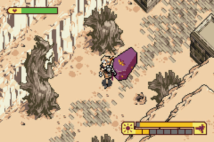 While smart, cautious play makes it possible to slip through much of Boktai's world without the aid of sunlight, certain key moments depend on it and simply can't be cleared in the dark of night. Bosses in particular require sunlight to purge them and ensure their ultimate destruction; once a boss is beaten, you must drag its coffin (another Django nod) to the entrance of the dungeon where a special device, the Solar Pile, awaits to convert real-life sunlight into special beams that burn the monster away once and for all.