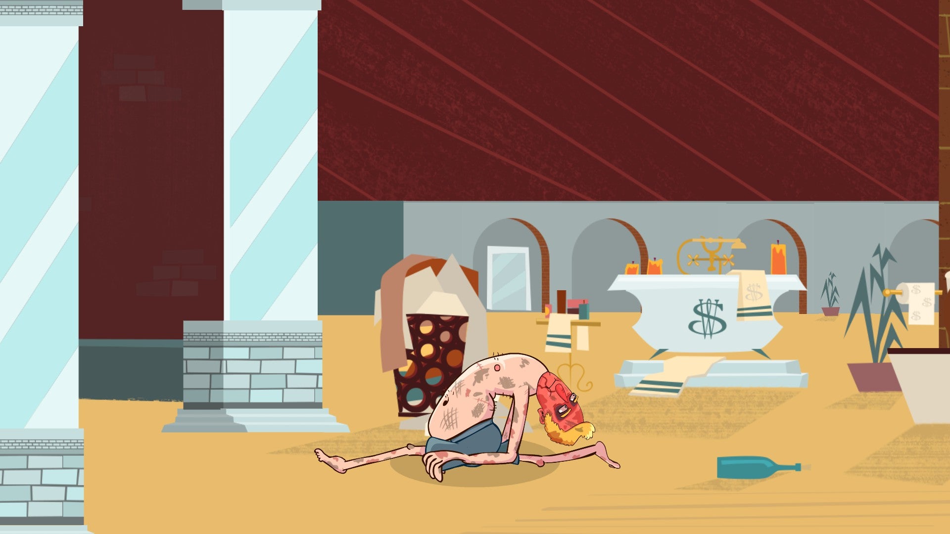 These are the fundamental moves of the game, and it only gets more complex from here. Once you've picked Samuel up from the floor, it's time to walk to his bedroom so he can take care of his ablutions. This involves brushing Samuel's teeth (using a combination of button presses and an oscillating power meter), emptying his bladder (using the bumper buttons to aim), taking a shower (using the bumper buttons to coordinate his hands to scrub his body correctly), and putting on some clothes (you know how it works by now). All this, while continuing to breathe, blink, and stay upright of course.