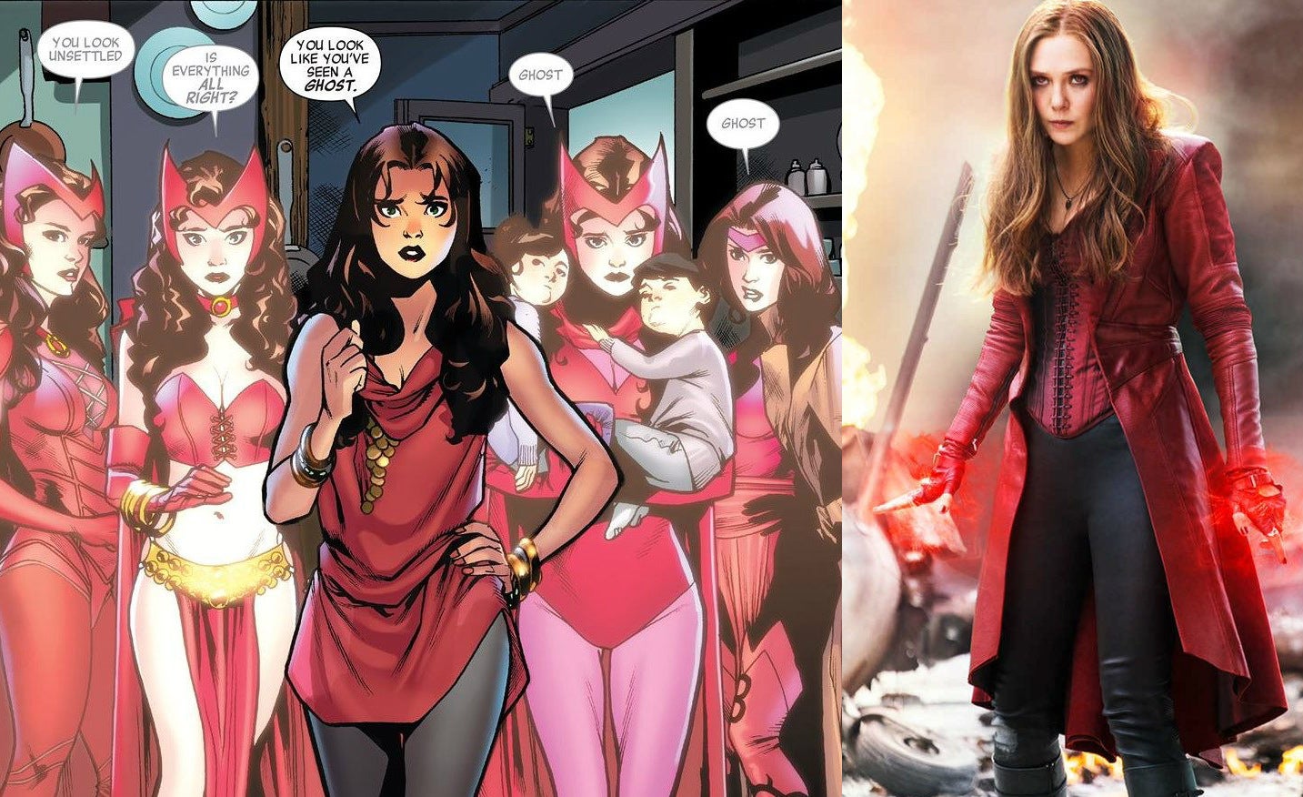 The Scarlet Witch in the comics is a creation of the High Evolutionary (yes, this is new backstory, but it's the current one), who gained the ability to create hex bolts that change probability. This was later expanded into the ability to tap into chaos magic, making her a rather strong magician. It gets to the point that she even rewrites the world twice, once in House of M and again at the end of Avengers vs. X-Men. The movie version has rough mind control powers given to her by experiments with an Infinity Gem and the ability to make things explode. She wears a red jacket occasionally!