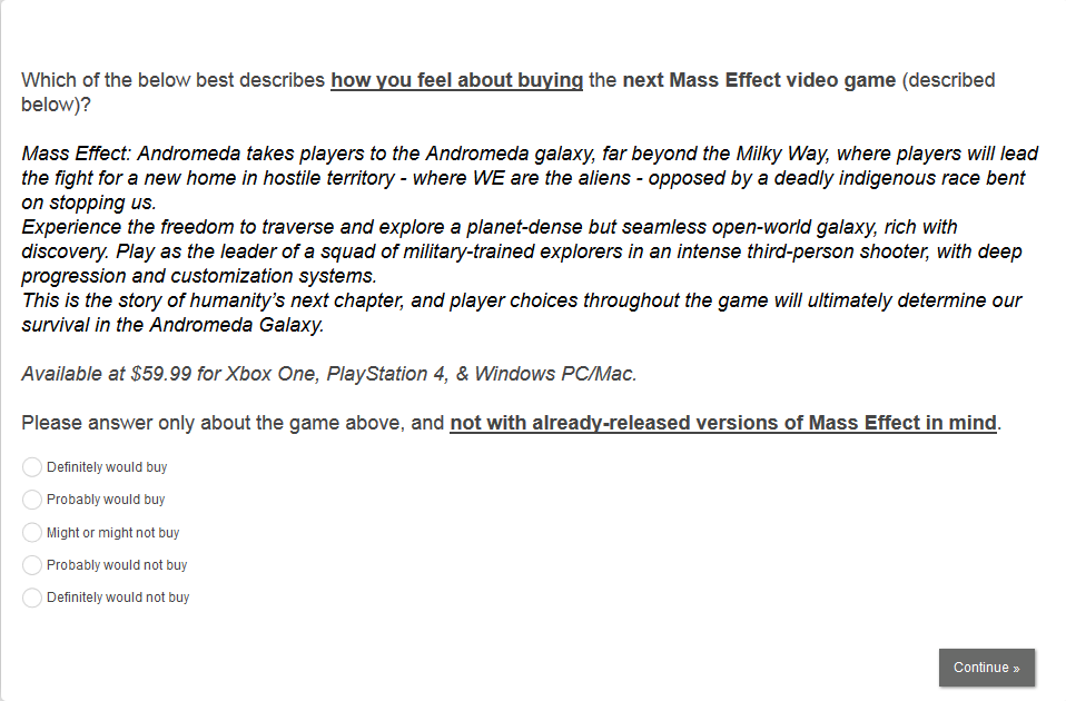 According to the survey, the human race is fighting to establish a new home in the galaxy, but they're being opposed by an indigenous race, bent on stopping them. It describes Andromeda as having a "planet-dense, seamless open-world", where your character will lead a group of military-trained explores and have "deep" progression and customisation systems.