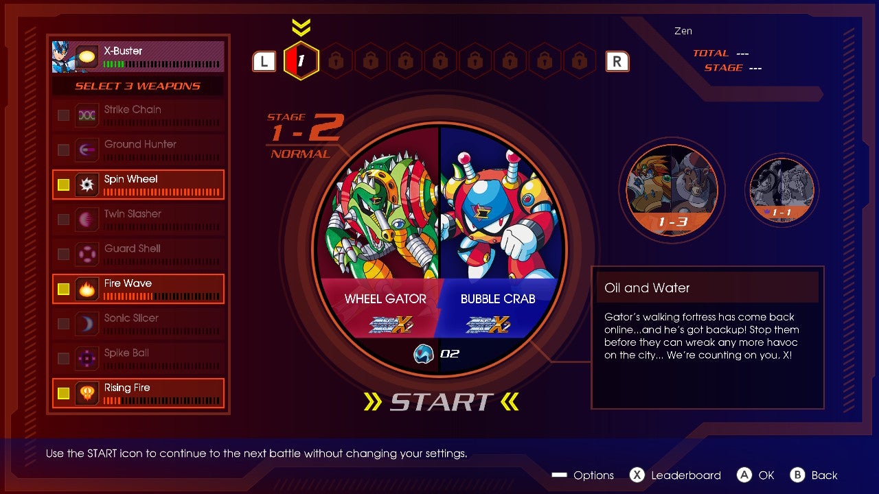 Finally, there's the X Challenge. This mode is a Boss Rush—you fight a series of bosses in a row—that pits players against two themed bosses at the same time. So the mode starts with an icy battle featuring Mega Man X's Chill Penguin and Mega Man X4's Frost Walrus together, while other stages bring together characters like Slash Beast and Crescent Grizzly, Spiral Pegasus and Dark Necrobat, or Blizzard Wolfgang and Burn Dinorex. Players pick three special weapons to take into battle with them, seeing how many boss pairs they can beat. Your performance is converted into a score which is then uploaded to online leaderboards.