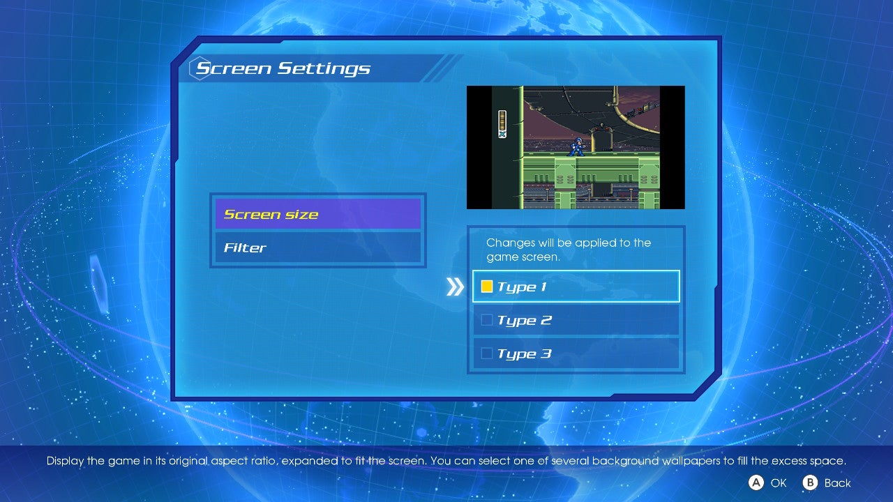 There's also a host of extras that we've come to expect from these collections. There's a few display and screen options: the default pillarbox look that stretches the picture to fit vertically while keeping the original 4:3 aspect ratio, a full border version with the original aspect ratio, and a mode that stretches the games vertically and horizontally to fit your screen. Using any of the non-fullscreen viewing options gives you wallpaper to fill in the black space, with each title defaulting to art related to the game in question. The usual filter options also appear, allowing for a smooth picture, simulated scanlines, or a crisp pixelated presentation. Mega Man X7 and X8, the 3D titles of the bunch, both have anti-aliasing and filtering, giving them the HD visual clarity they didn't have on the PlayStation 2. (You cannot turn off the graphical improvements on those games.)