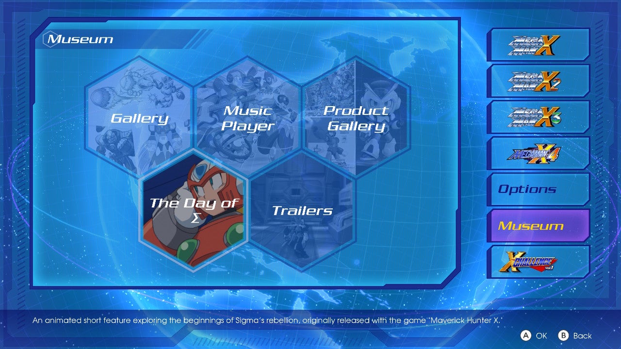 Filling out the rest of each Collection are Hunter Medals, which are achievements specific to the Collection you're playing, a gallery of concept art, a Music Player, Announcement Trailers, The Day of ? animated shorts relaying the background of the series, and a Product Gallery showing various Mega Man X toys, artbooks, and soundtracks. The Gallery and Music Player have different content depending on which Legacy Collection you're playing, while the Trailers, The Day of ?, and Product Gallery are the same for both versions.