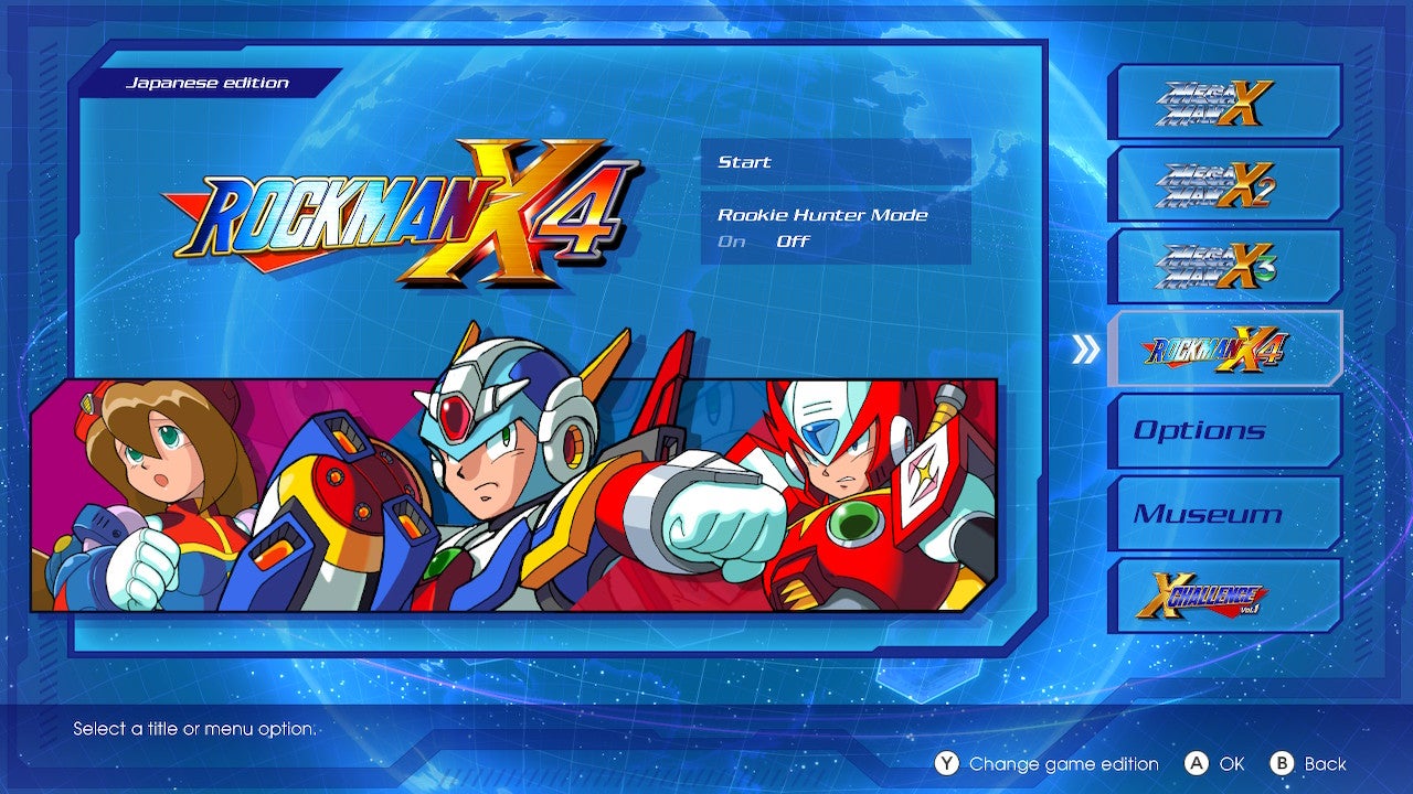 Each game in the Legacy Collection has its own internal difficulty options, but Capcom also added the Rookie Hunter mode for each title. The mode lowers the damage you take by half and prevents instant kills from spikes and bottomless pits in the later games. If someone's just getting into Mega Man X, it's a nice option to have.