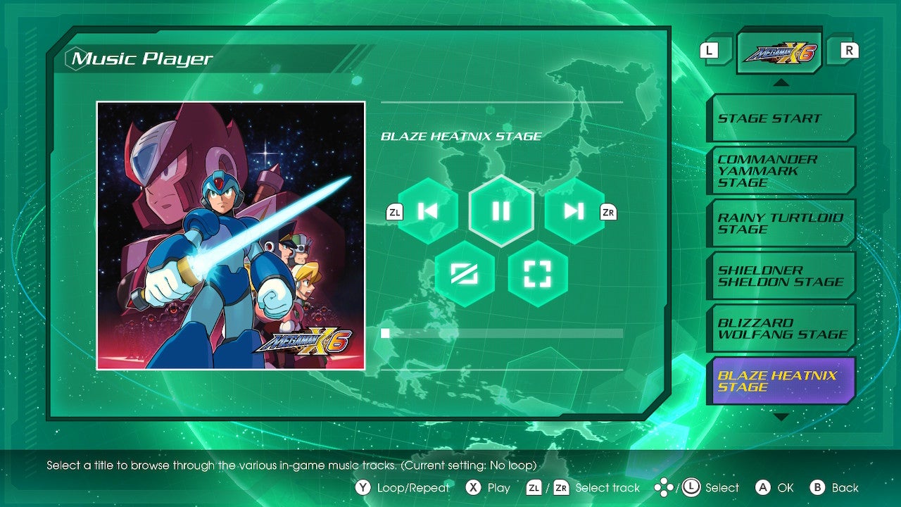 Like X4, Mega Man X6 had unique opening songs. Those songs, Moonlight and The Answer, are gone, replaced with a generic track instead.