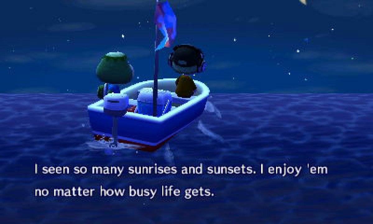 If you pay careful attention to Kap'n lyrics, you'll notice he's making remarks that wouldn't really mean much to a first-time player or, by extension, your fresh-faced protagonist. But for those of us who remember Kap'n from his appearance in the GameCube Animal Crossing, his lamentations on hair loss and musings on how having a daughter has changed his life speak to the years that have passed since we all first played Animal Crossing. Certainly I have a lot less hair on my head than I did in 2002, and my wife and I frequently discuss the prospect of having kids, so his ditties hit close to home. On top of that, when Kap'n does directly address my in-game avatar, it's with an almost paternalistic tone. The result is a surreal simpatico between myself and Kap'n, as the game (or rather, its writers) feel my own pains of getting older as we watch some ageless whippersnapper run around retracing the steps I took a decade ago and surpassing those efforts.