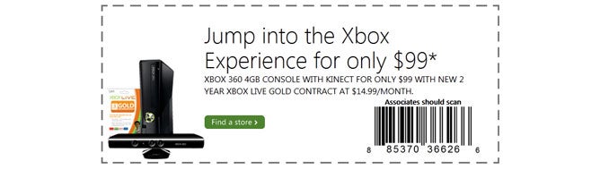 The bundle includes a 4Gb machine with Kinect for $99. And a two-year subscription to Xbox Live Gold at $14.99 per month.