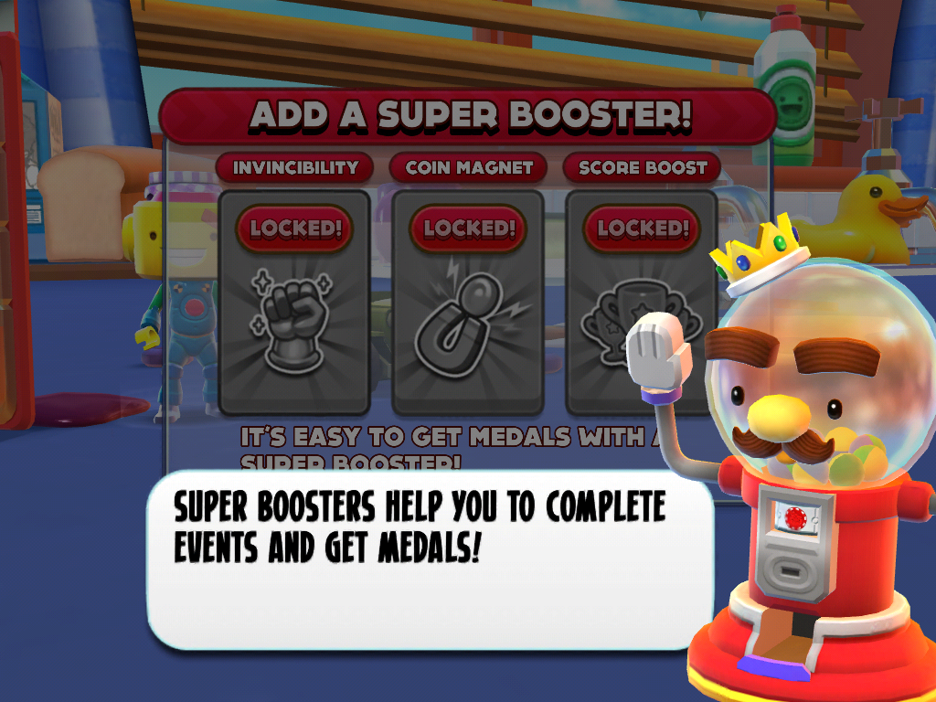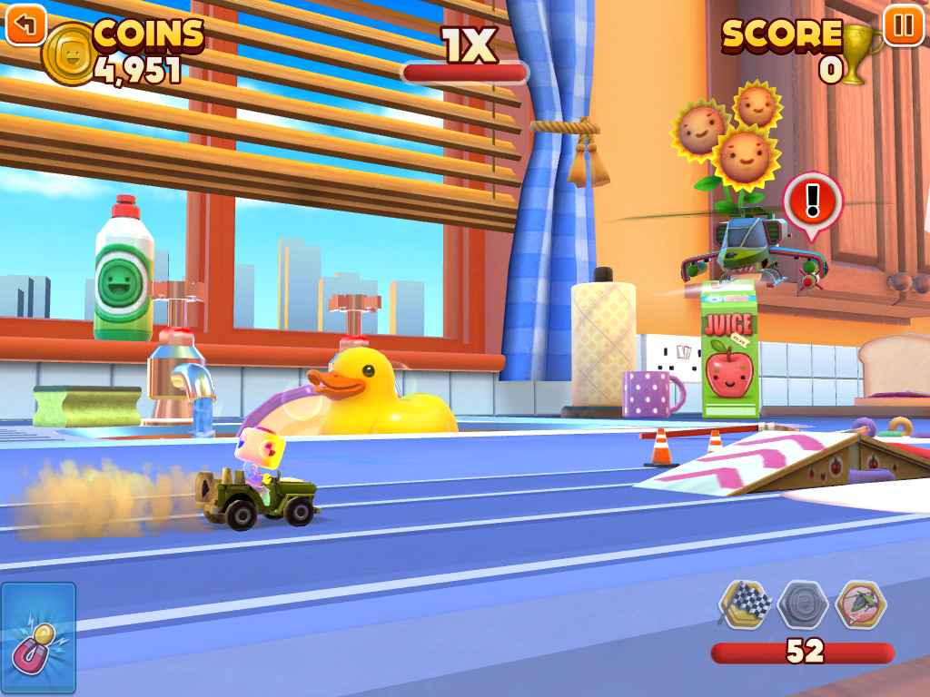 There's a strong focus on earning "coins" to buy upgrades, new characters and new vehicles, for example, and while you earn coins at a very healthy rate through normal play, it's difficult not to notice that "add coins" button underneath the readout of how many you have. Or the prompt to purchase "super boosts" when you retry levels in order to make acquiring medals easier. No skill needed here, folks; just pay up for an invincibility or score booster powerup -- and to make matters worse, the game doesn't tell you what the price of these "super boosts" is on the main screen -- you have to sign in to your iTunes account first, and it's not made at all clear whether or not you'll have the option to cancel the purchase after you've entered your password.