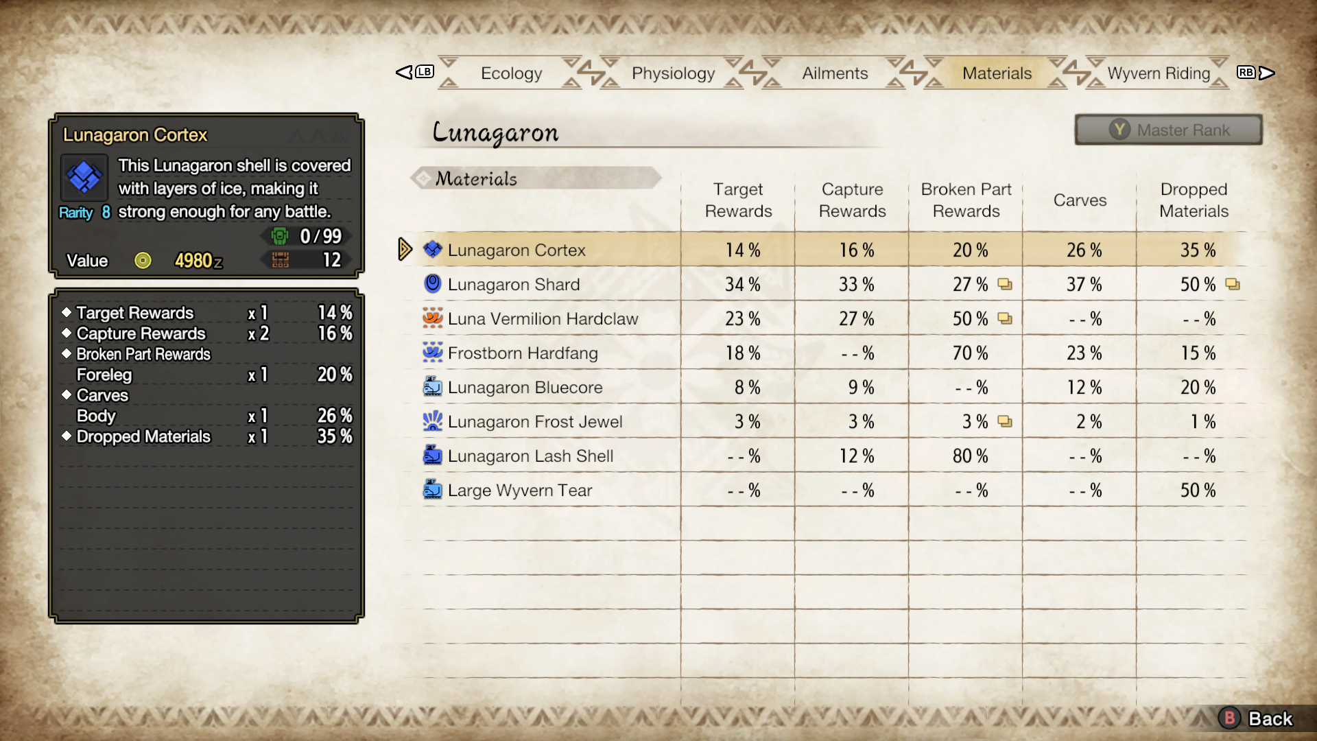 By this point in your Master Rank journey, you should have taken out a few Blood Orange Bishaten, too. Use the weapons you get from defeating this monster here; a weakness to Blast and the massive Blast build-up those weapons confer is useful here. Failing that, get your best fire gear from High Rank and hope that does the job here. If you're using fire (Rathalos weapons, your time is now), make sure to target Lunagaron's abdomen the most; its biggest Fire weakness is here, and you'll find it'll interrupt some key attacks if you lay down enough force.