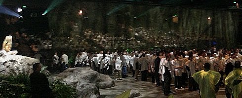 - All the performers are going "mental" at the front of the stage.