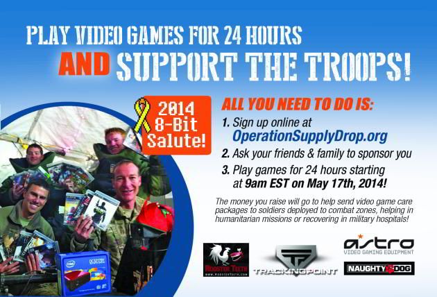 Operation Supply Drop’s third annual fundraising event, the “8-Bit Salute”, will take place May 17 - 18, 2014 and gamers can play all day and night to help raise funds to send video game equipment and titles to US troops deployed to combat zones or recovering in military hospitals. Naughty Dog, Wargaming America, Rooster Teeth and ASTRO Gaming will be part of the charity event.