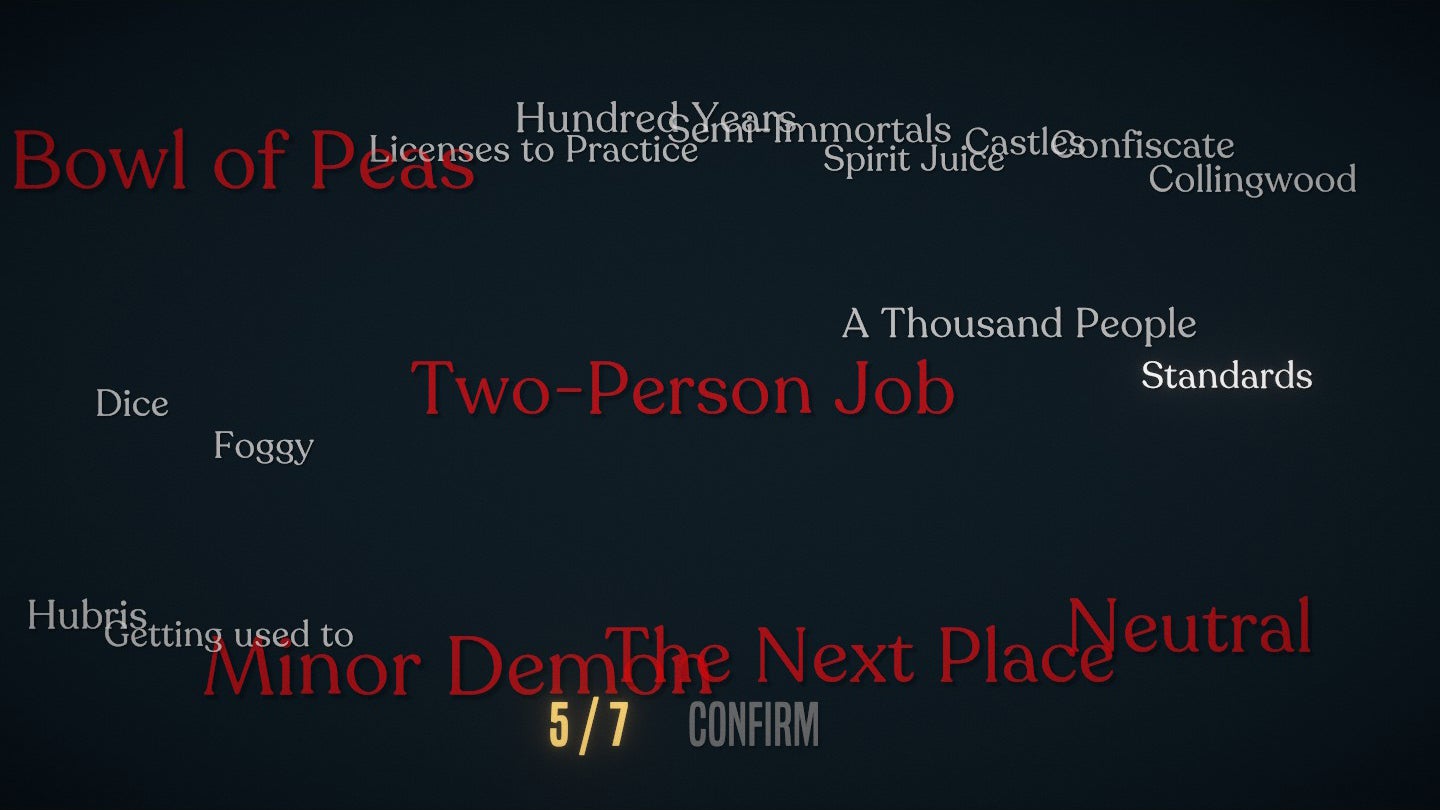 I unfortunately stumbled a bit with this system. Over the course of conversations in the episodic sections, a word or phrase is occasionally highlighted in yellow. Click on it, and there's a short glossary-like explanation, usually offering further context about whatever was said. These words show up at the end of each episode, floating around in a sort of word cloud. Then, it has you pick just seven of them.