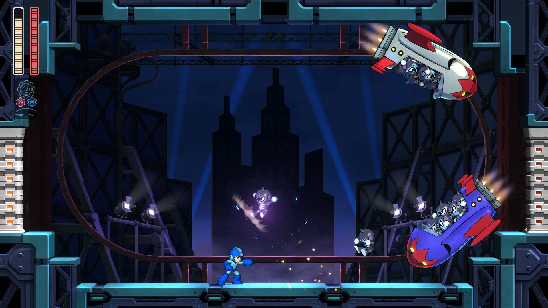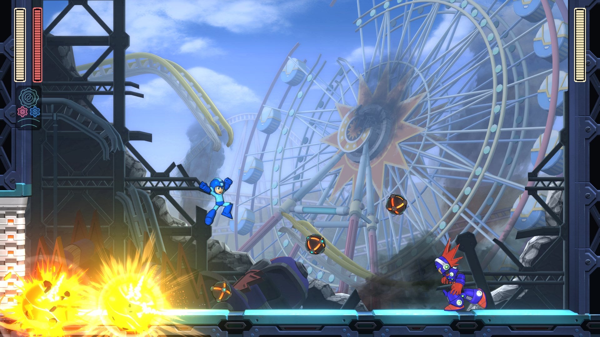 Familiar enemies, like Sniper Joe, are joined by new ones, like explosive mini-bots and "fireball-launching foes." The stage's mid-boss was also unveiled, and sticks to the theme-park vibe, with explosive mini-bots shooting around in a rocket roller-coaster.