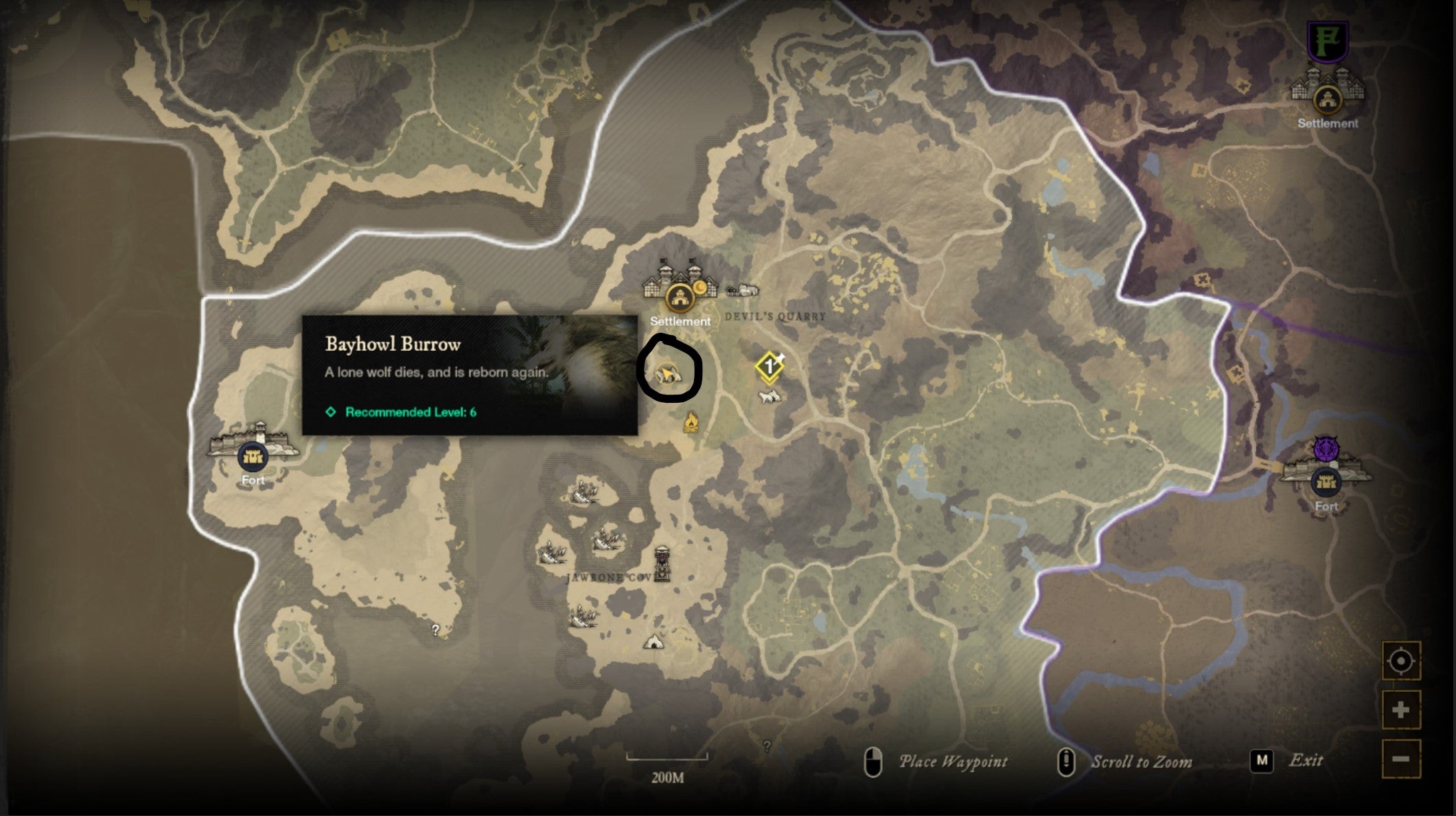 To get to Bayhowl Burrow, look to the southwest of Monarch's Bluff Hamlet. Then look for a rocky den that wolves spawn around, and inside you can find a Saltpeter node.