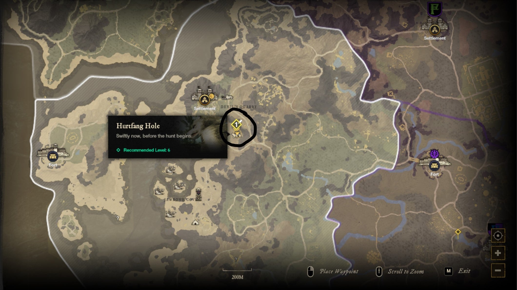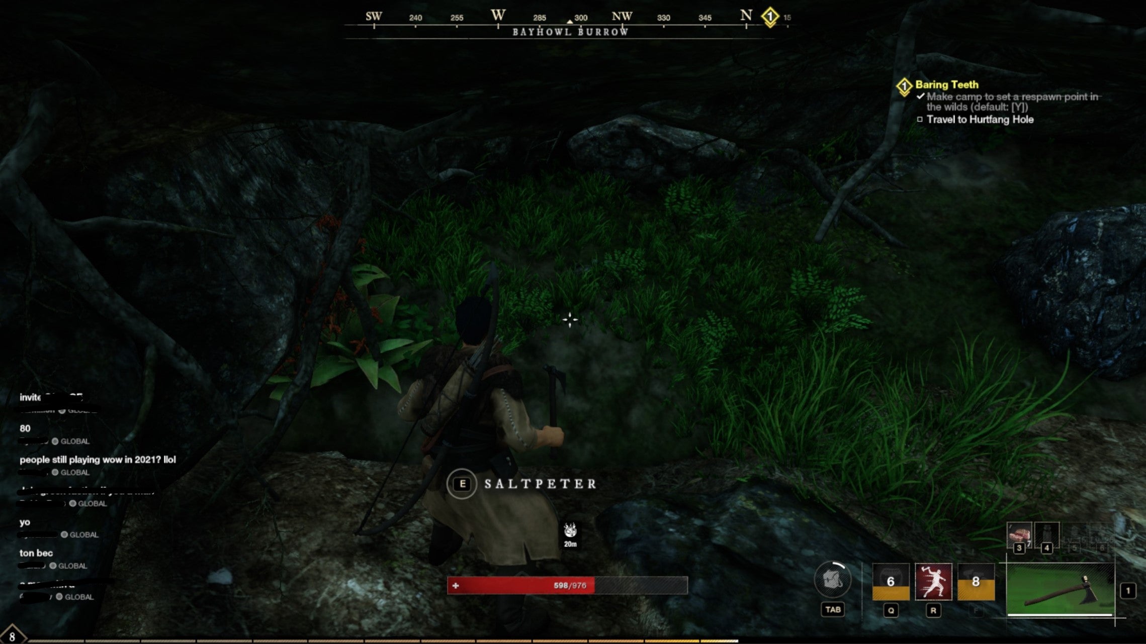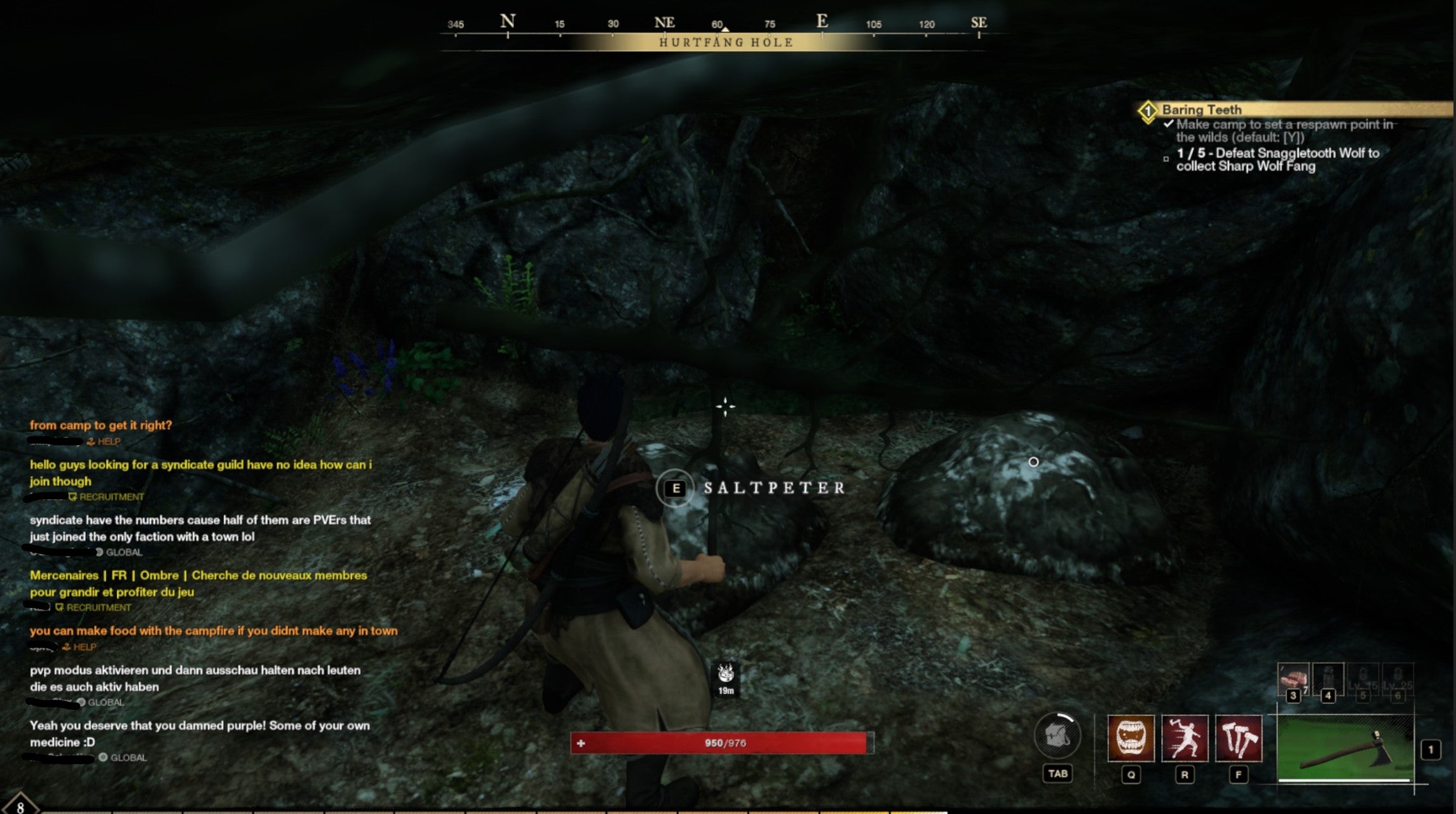 Hurtfang Hole is found to the southeast of Monarch's Bluff's Hamlet. Again, look for a rocky outcrop towards the north of the area where wolves spawn and you can find Saltpeter Nodes inside.