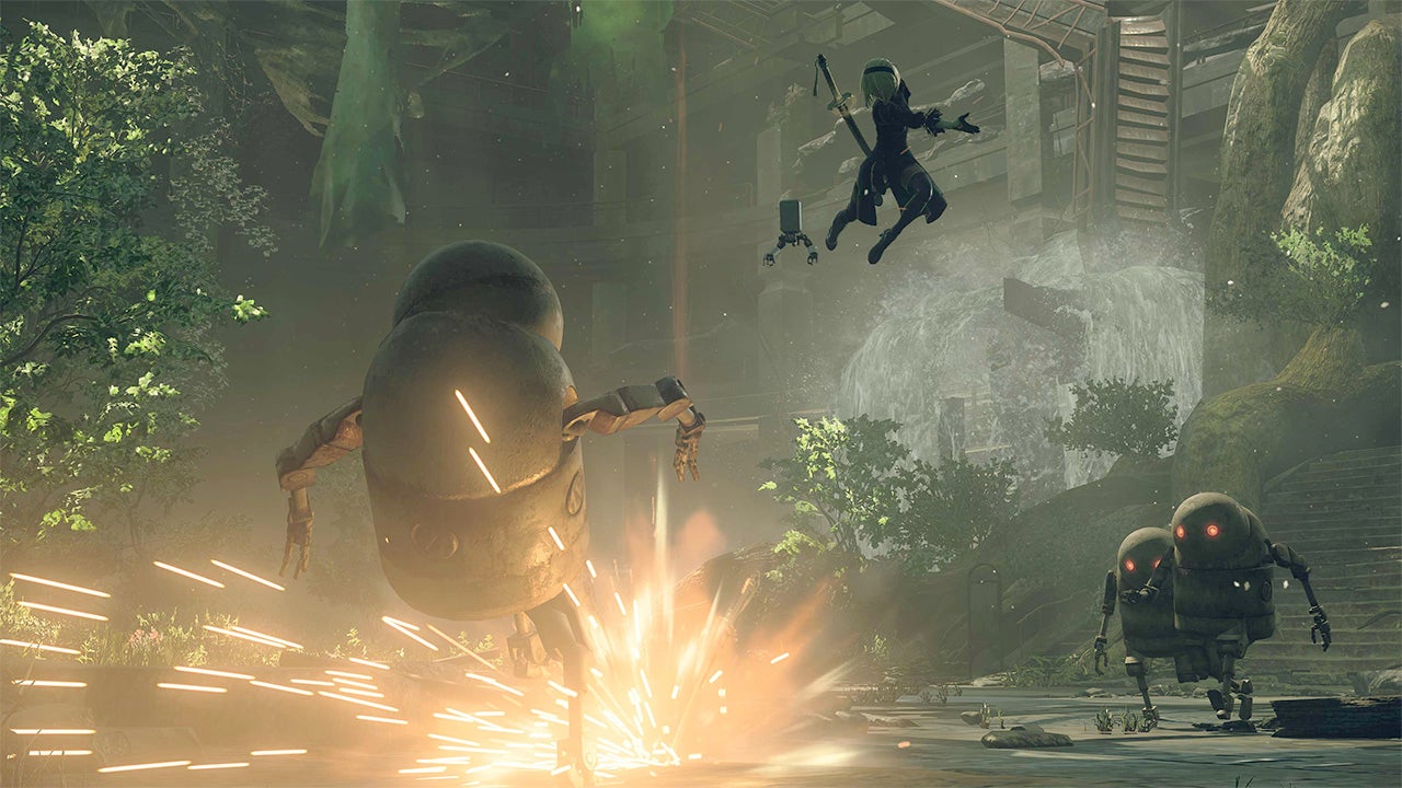 Platinum's touch shows in what I've seen of Automata. It exudes a polish not found in Taro's previous games, lending its characters a particular look and style that makes it feel distinct. Automata's story features a war between human-like androids and robotic creatures, the latter which vary from machines resembling Google's Android mascot to huge, Iron Giant-like creatures.