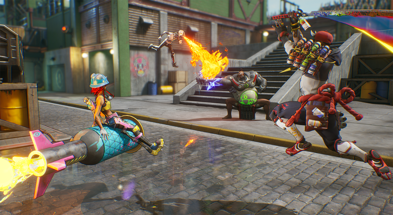 The final product feels like a cross between a hero shooter like Overwatch and a MOBA like League of Legends. The characters are distinct and more than a little crazy—a punk samurai; a guitar-wielding fighter who reminds me a little of Lord Raptor from Darkstalkers; a dolphin. Its loud colors bring to mind Sunset Overdrive, which itself was a reaction to the grey and brown palettes that dominated the Xbox 360 era.