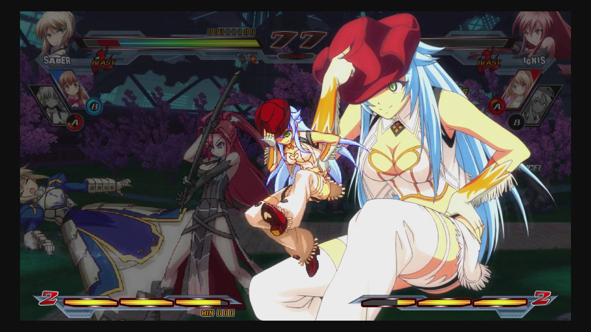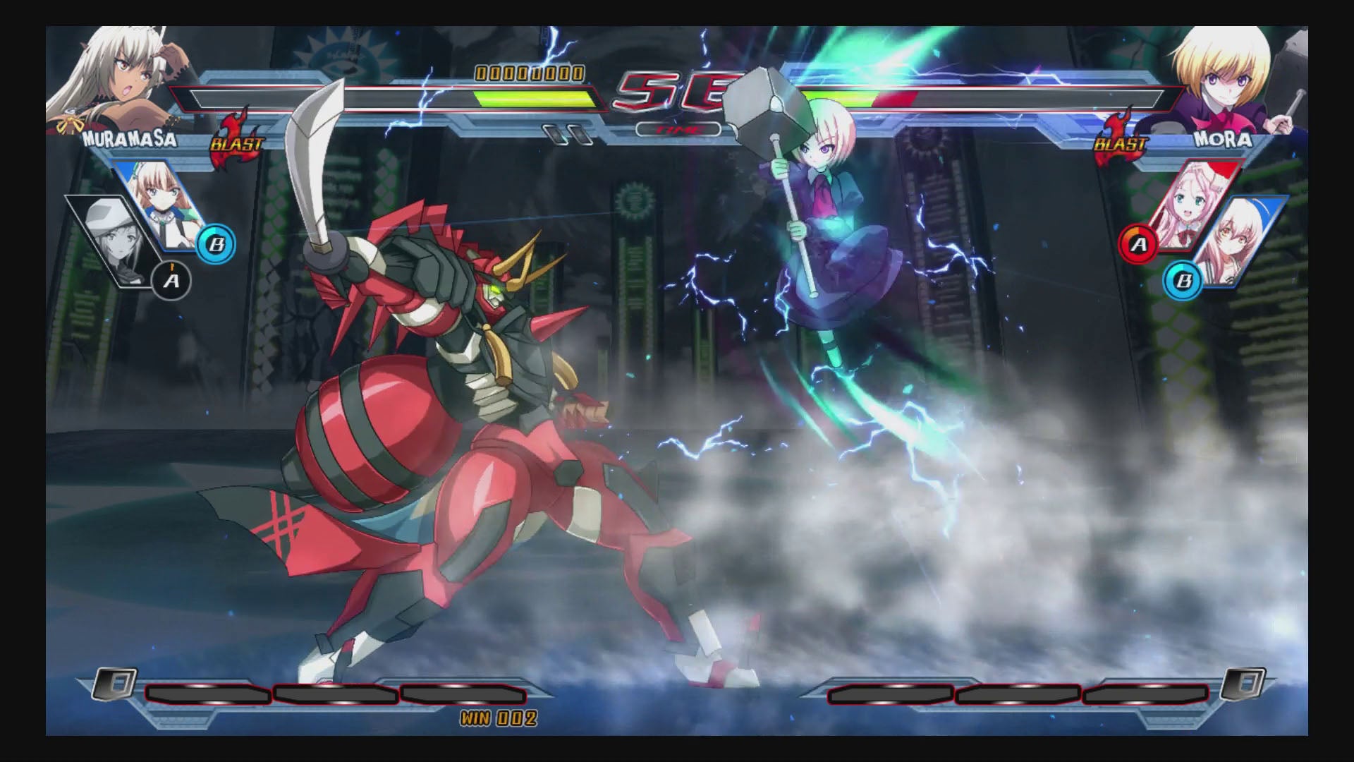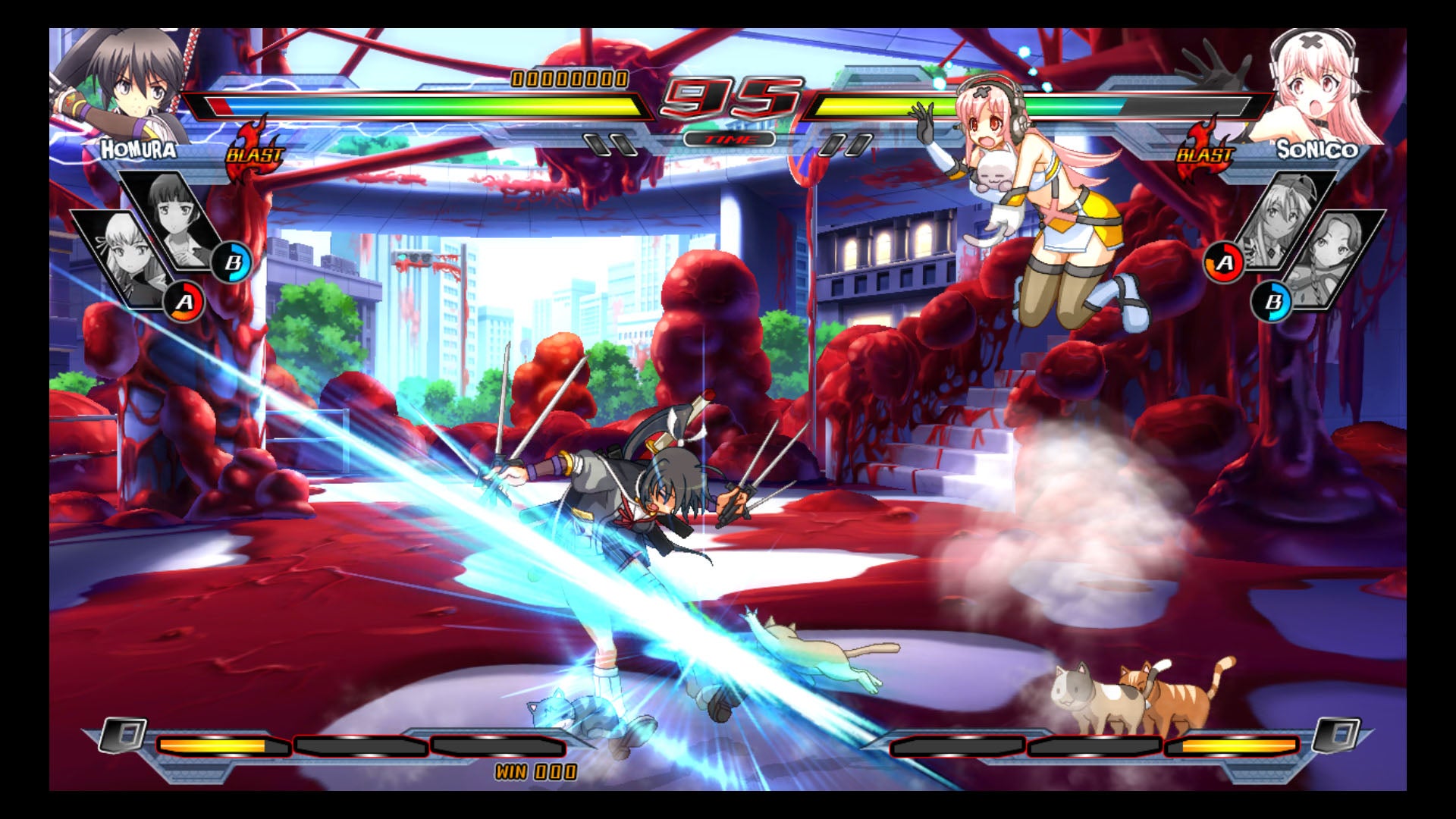 Nitroplus Blasterz does have the most fun when it comes to its characters. there's basic, straightforward fighters like Saber (Fate/Zero), but there's also Echika (Tokyo Necro), a rather mobiler grappler; Sansei Muramasa, who uses spider webs to pull herself and her opponent around the battlefield; Super Sonico, who actually never attacks on her own; or Saya (Saya no Uta) who attacks with cancerous flesh and leaves bits of herself floating to set up combos.