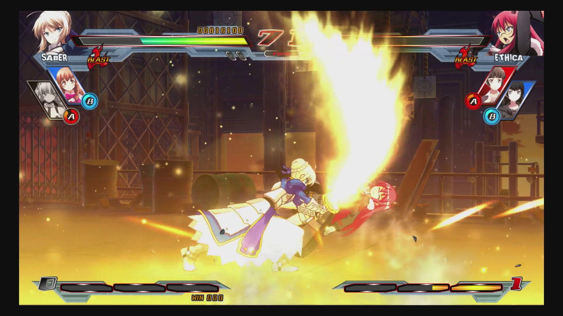 Nitroplus Blasterz does not benefit from the same visibility. Despite a decent cast - 14 playable and 20 support characters - a number of these characters are characters of visual novels that have seen a limited release in the US or are simply mascots from Japanese companies. Saber from Fate/Zero and Super Sonico are largest characters here, and the next two in line, Aino Heart from Arcana Heart and Homura from Senran Kagura, are DLC only fighters. (Free for a limited time.) There are some support characters who are from more visible and recent series - Amy from Gargantia on the Verdurous Planet, Akane from Psycho Pass, or Yuki from School-Live! come to mind - but if you're not hip deep in imported Japanese culture, this game will fall short for you.