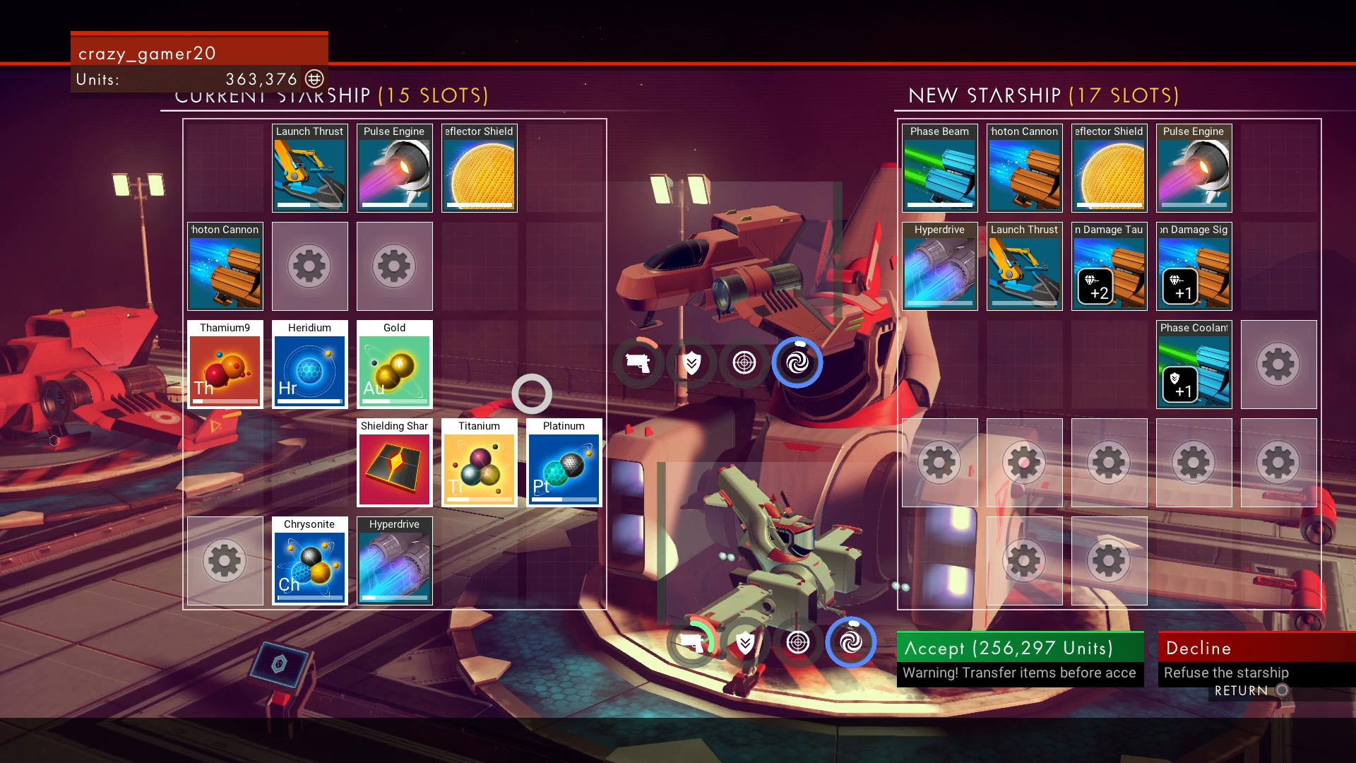 When you're comparing starships, note the upgrades and bonuses those upgrades provide in comparison to what you have, as investing in a superior starship is a good way to skip over several tech upgrade's worth of progression. Pay attention to the condition of the starship you're trying to buy as well. Look for damaged parts and check the current fuel levels, as they can represent hidden costs that you may not be prepared to pay. Also check how many cargo slots the starship has compared to yours. If it has less than your current starship, then you'll need to think about what you're going to drop or transfer to make everything fit.