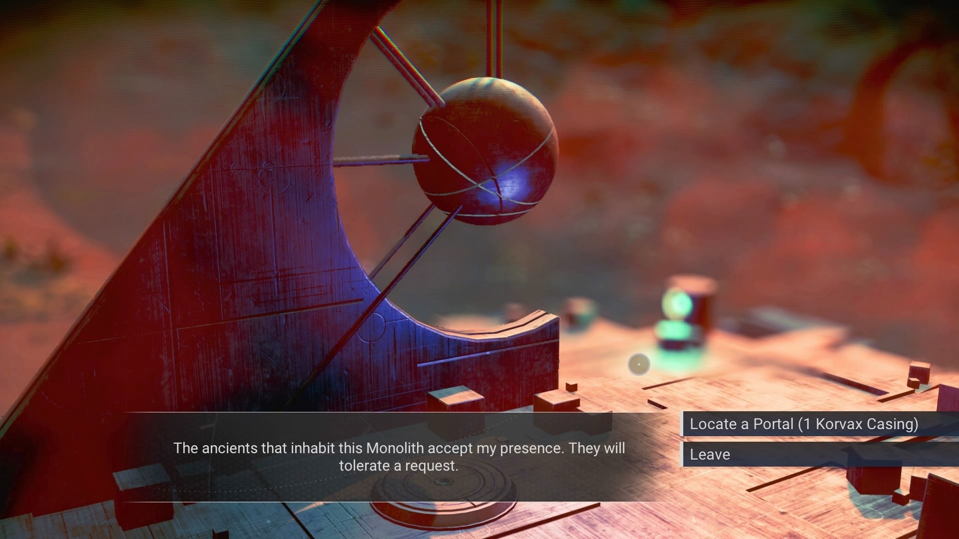 Interact with the Knowledge Stones around the monolith, this will allow you to learn some new words. Interact with the monolith and you'll be given a riddle to solve. Each is different, so just think carefully about your answer. If you get it wrong then just reload the autosave from when you exited your ship. Select 'Locate a Portal'.