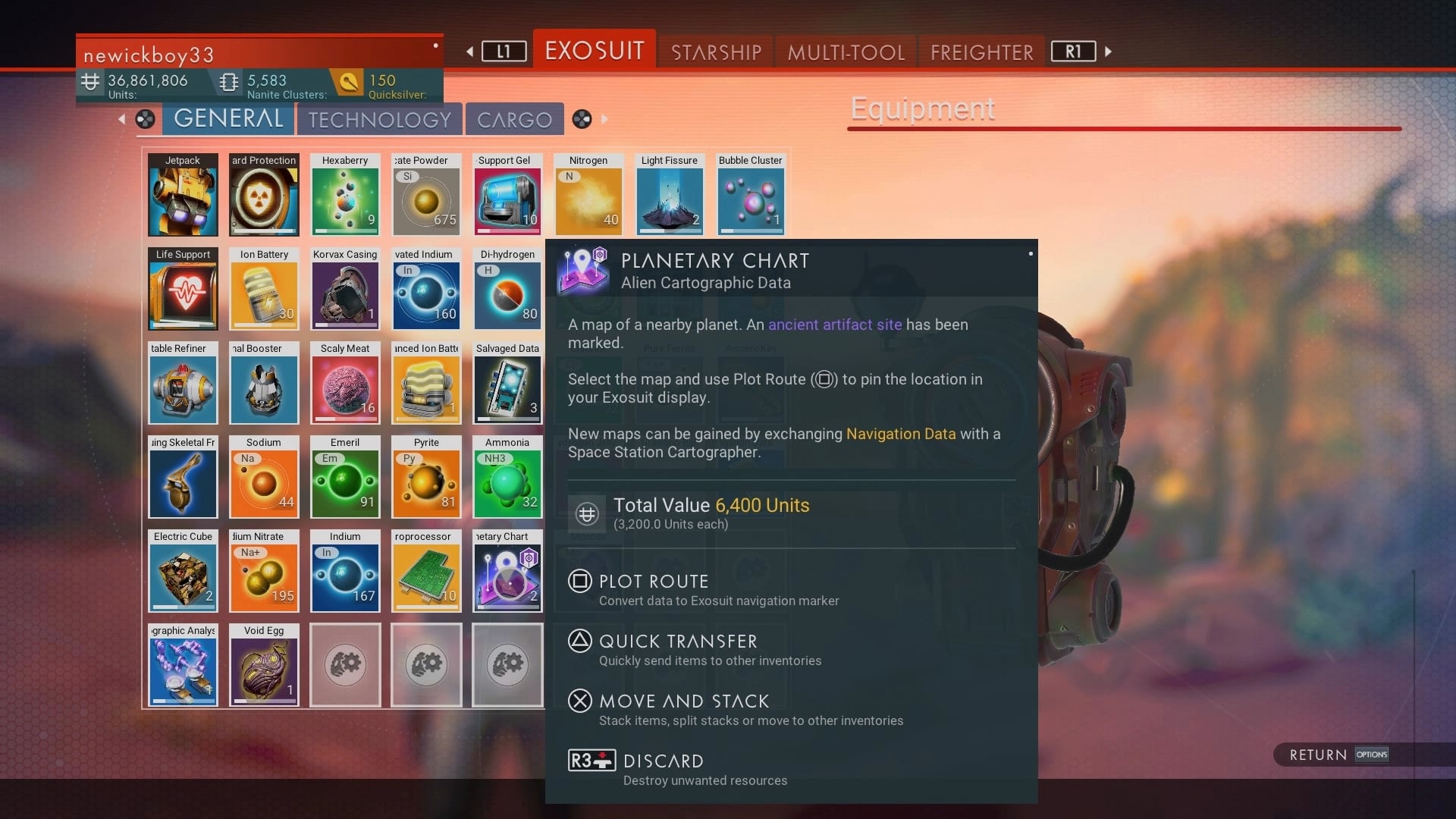 Go to your Exosuit menu and locate the Planetary Charts. Hold square or X to open one, a location will be pinpointed on your HUD. You're aiming to get an Alien Monolith to show, keep opening charts until this happens. Head to the monolith