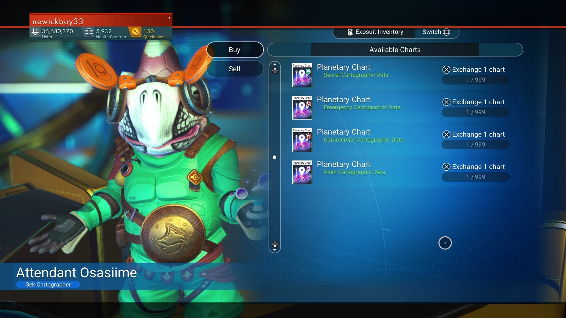Speak to the Cartographer and select 'Exchange Maps'. This will allow you to exchange Navigational Data for maps. Select the Planetary Chart with Alien Cartographic Data. We recommend purchasing a couple of them. Before you leave the station, go to any of the aliens standing next to their ships and buy one of the items below, depending on what kind of system you're in: