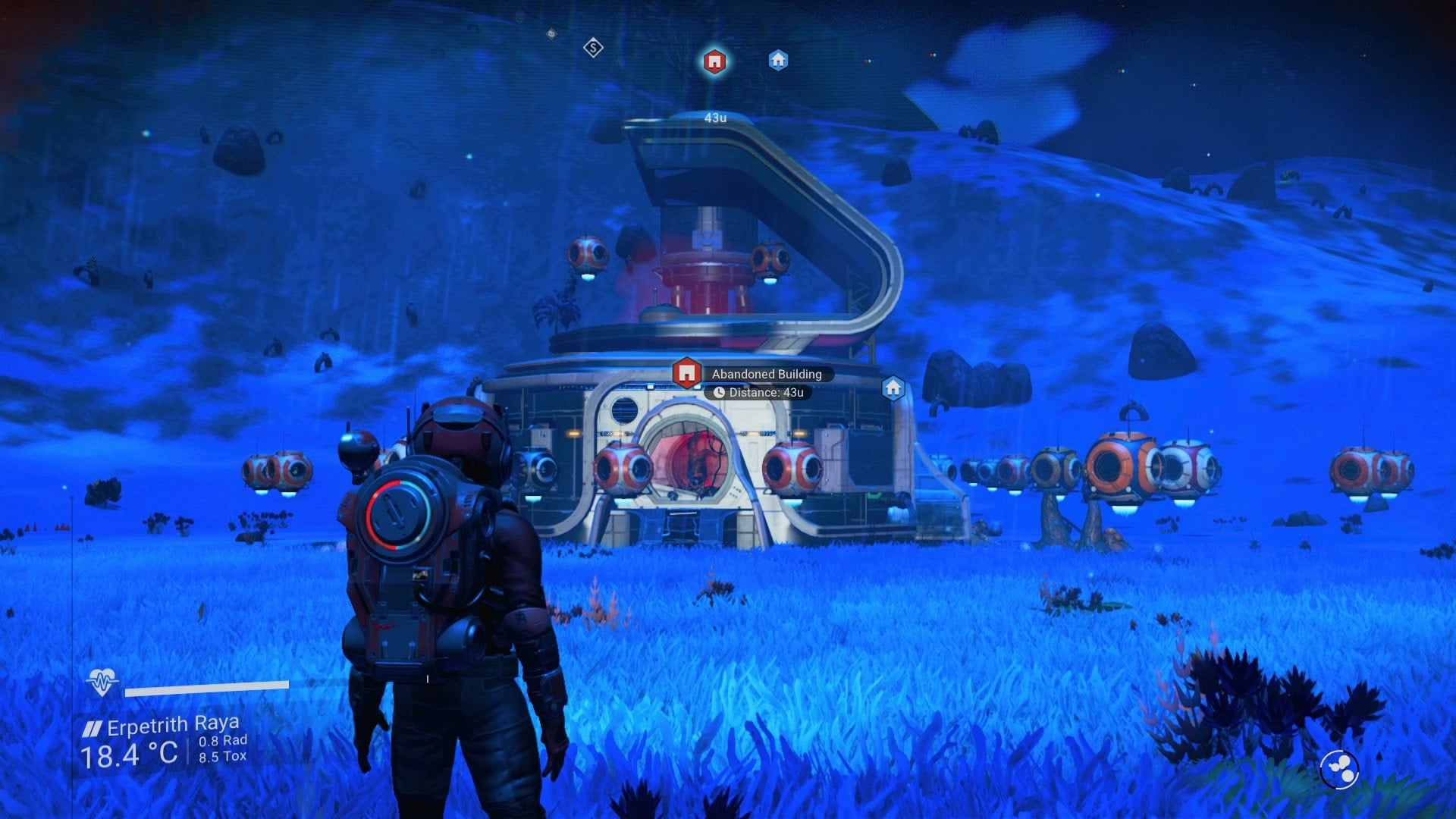 These three clues will point you to the right place. The first reveals that you need to head to the planet in the system that has water. Head to your Discoveries tab to check this. The second clue tells you to head to the planet's north pole. It's the planet you are on, so just fly up to the upper apex of the atmosphere and head in the direction of north using the compass on your HUD. Fly north until it flips around to being south, indicating that you are at the pole. Alternatively, there are a lot of player-made structures at the location so you can head to the base markers. Once there, land your ship. The final clue refers to an abandoned building or base. Use your scanner to locate the abandoned building nearby and head there.
