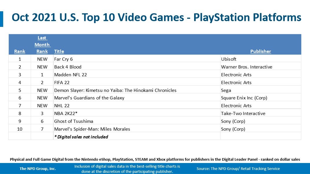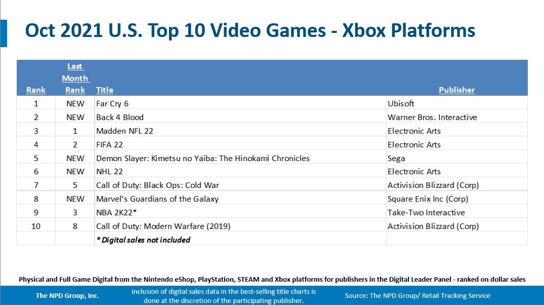 In software, Far Cry 6 debuted as the best-selling game on both Xbox and PlayStation platforms for the month and is now the eighth best-selling game of 2021.