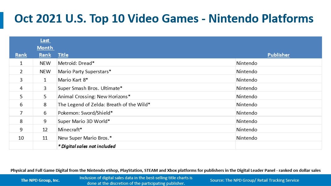 Metroid: Dread was the third best-selling game, and it came in first on the Nintendo Switch chart. Metroid: Dread saw the best launch month sales of any Metroid game in tracked history with physical dollar sales almost double that of Metroid: Prime.