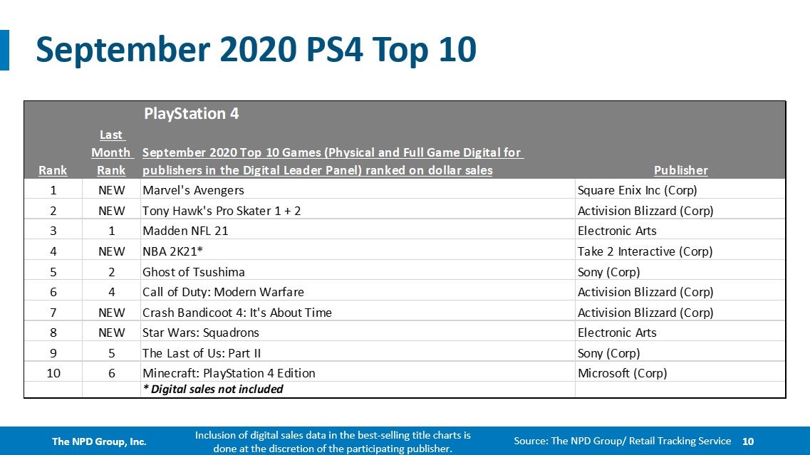 Marvel's Avengers was the best-selling title of September. Launch month sales of the title were the highest for any superhero game in US history, trailing only Marvel's Spider-Man. The game is now the seventh best-selling game of 2020.