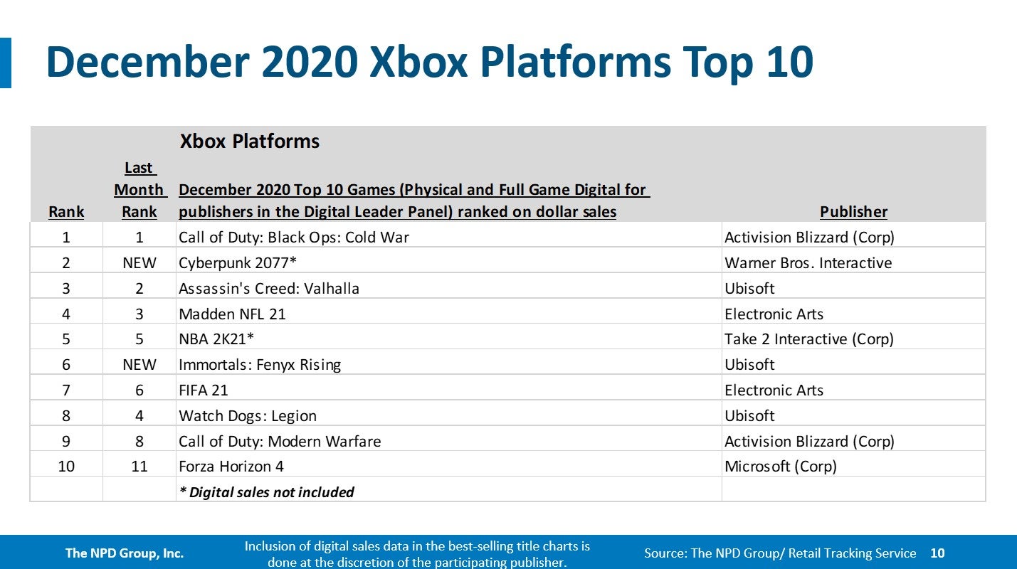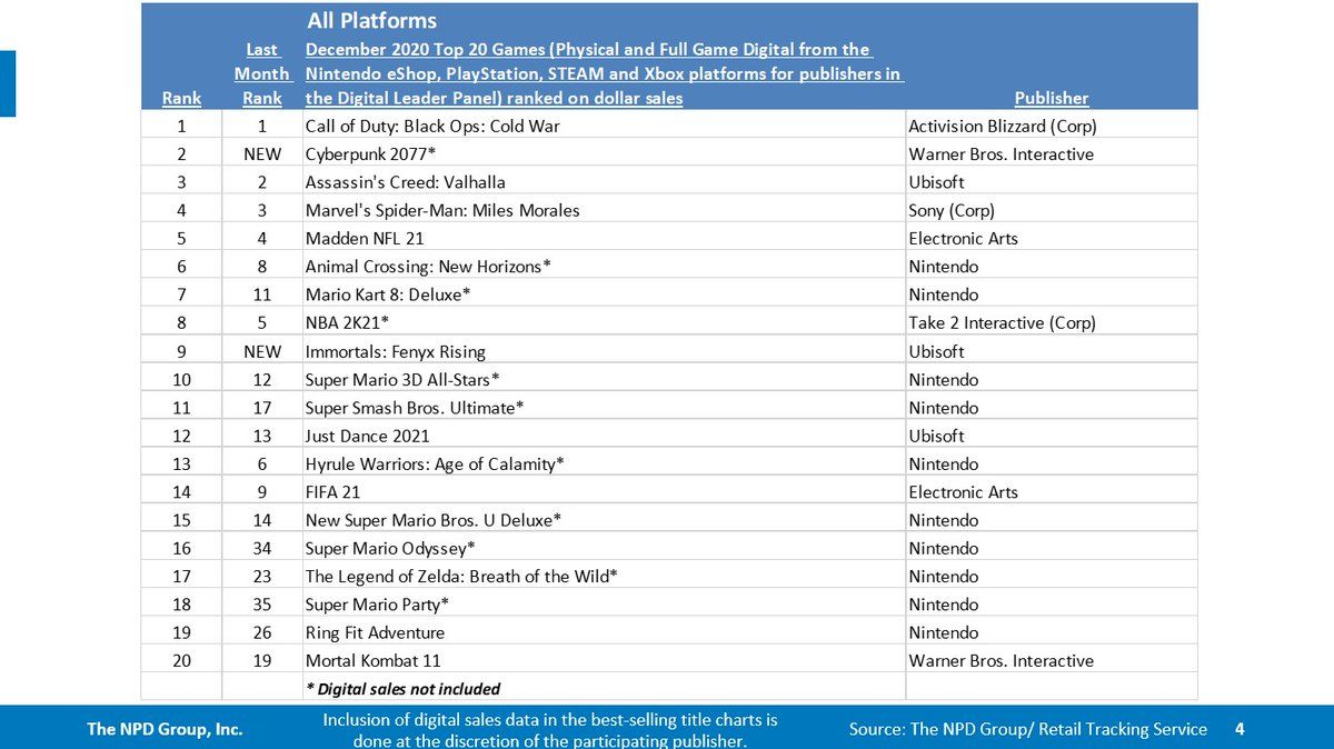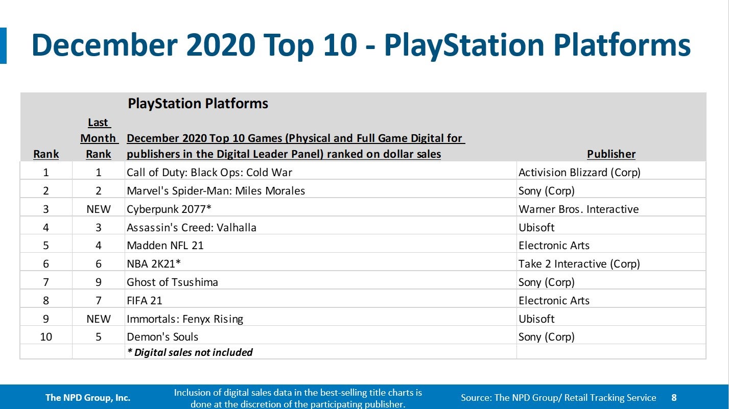 Cyberpunk 2077 was the second best-selling game of December and the nineteenth best selling retail game of 2020.