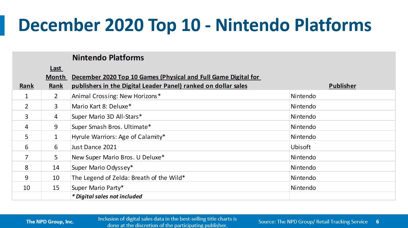 In software, half of the top 20 best-selling games of December 2020 were published by Nintendo.