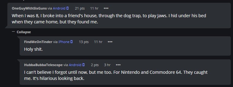 "I can't believe I forgot until now, but me too. For Nintendo and Commodore 64," another redditor, "HubbaBubbaTelescope," replies. "They caught me. It's hilarious looking back."