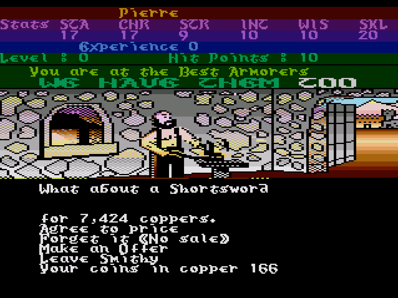 The sense of aimlessness in The City was intended to be resolved over the course of seven games in total. The player would begin in The City, which acted as a "hub world" for the other six titles, which were The Dungeon (originally intended to be The City's sewers), The Arena, The Palace, The Wilderness, Revelations and Destiny. Each would feature its own unique gameplay mechanics -- the Arena would send you into gladiatorial combat, for example, including against other characters on your save game disk; The Palace, meanwhile, would allow you to become a ruler of the city and make changes to its layout.
