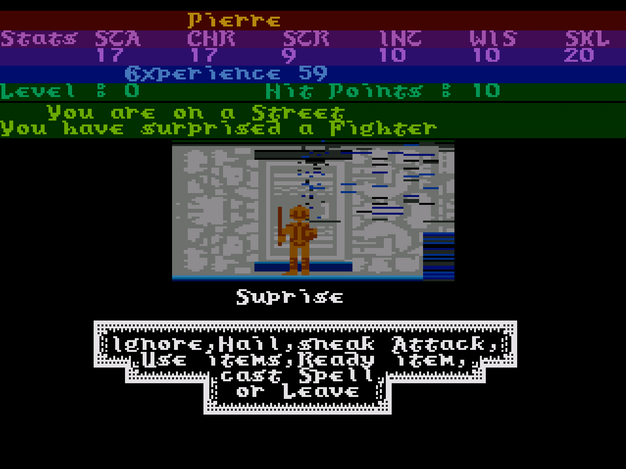 One of the most interesting aspects of the game at the time was that not everyone or thing you came across in the streets via random encounter was unfriendly. The natural reaction for an RPG player at the time was to attack anything that showed up unexpectedly, but this was a sure-fire route to a quick death in The City. Attacking civilians and town guards would lower one of your "hidden" statistics that tracked your reputation, causing you to be attacked on sight by formerly friendly characters after a while. The key thing, though, was that you had the freedom to be "evil" if you wanted to; if you could build up your strength and equipment enough to a point where you were hard to defeat, sure, you could absolutely go on a killing spree.