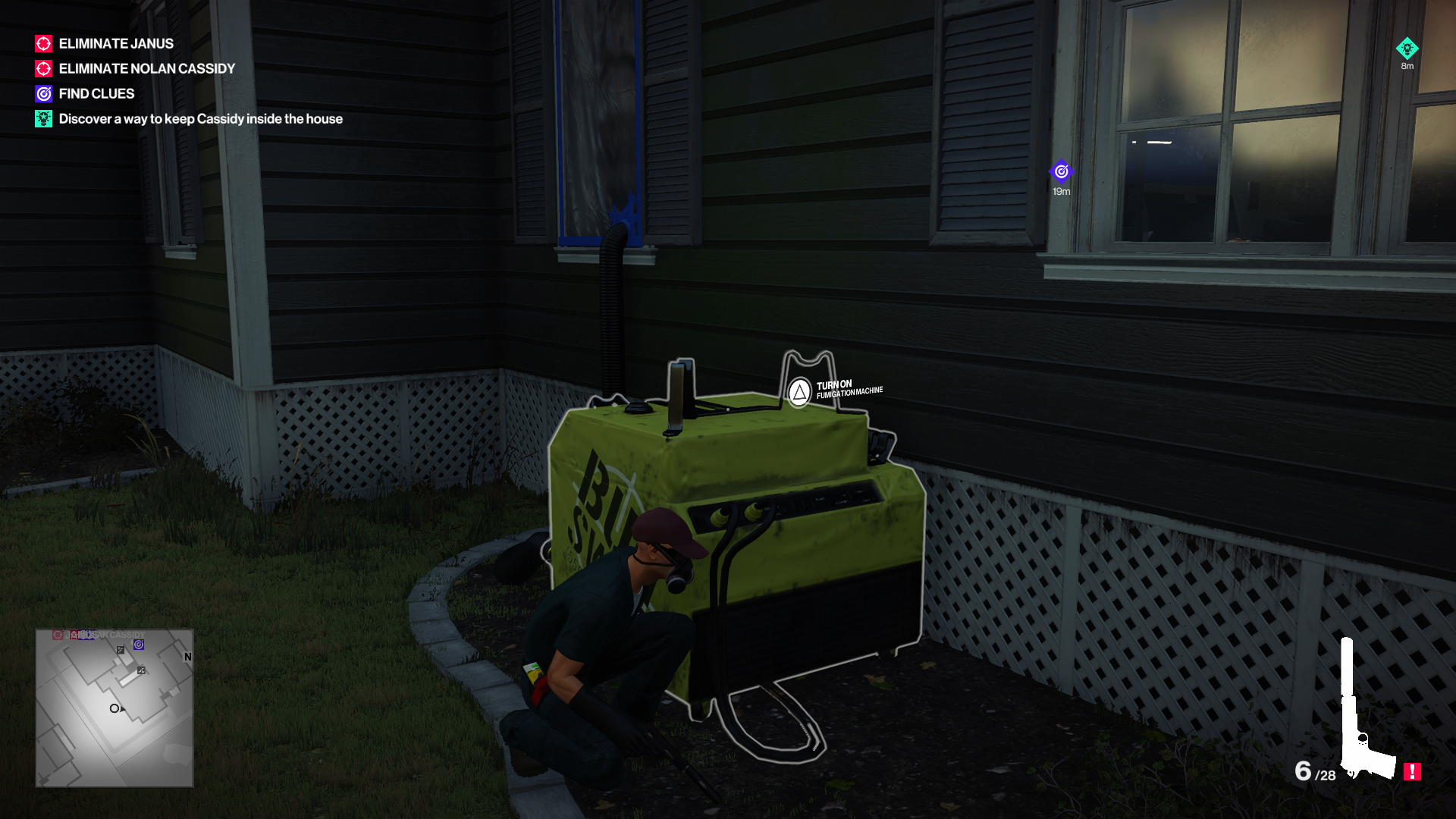 47 has to pick up the special chemicals needed for the fumigation. Then you replace the exterminator with one tall, bald hitman and create a distraction so that Cassidy and his men will enter the home. Once everyone's inside, you dump the chemicals into the fumigator, which will knock everyone out. Then 47 can calmly walk into the house, erase any security footage, and dispatch Cassidy while he and his men are taking a nap. No muss, no fuss. —Mike Williams