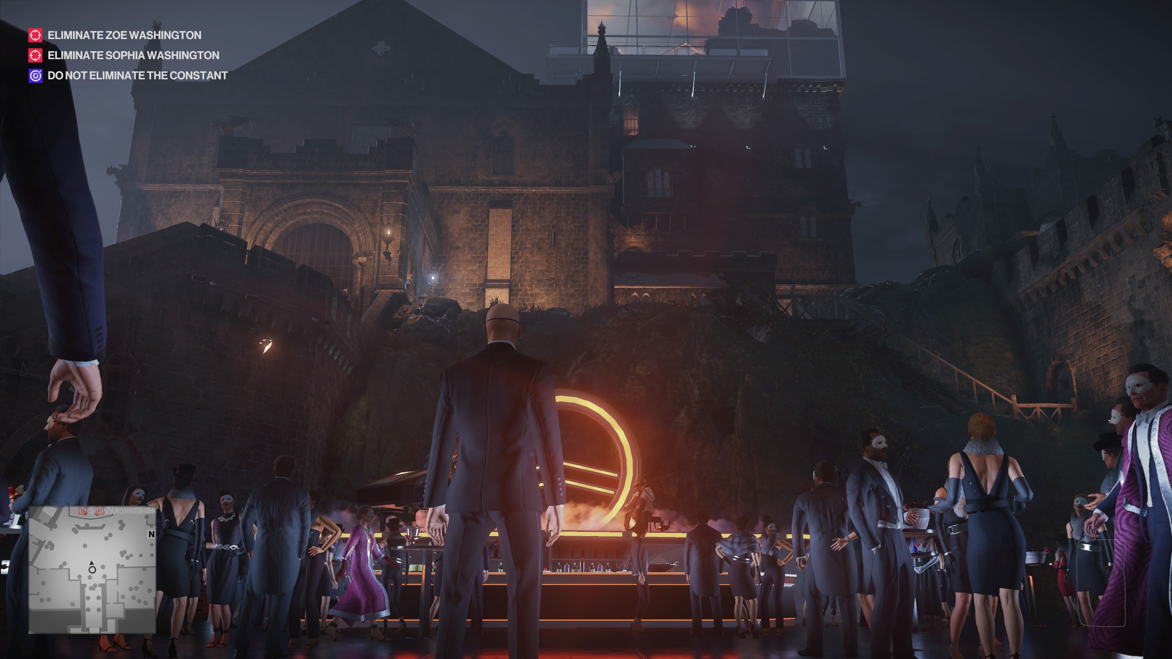 On the Isle of Sgàil, Agent 47 is tasked with killing the twin Washington sisters. The background of this mission is a giant party and ceremony for the Ark Society, an Illuminati-style gathering of the rich and powerful. The centerpiece of the event is a ceremony that's supposed to symbolize the Ark Society surviving the downfall of civilization: one of the Washington sisters steps into a metal phoenix effigy, which is lit on fire, and then the chosen sister escapes out of the back.