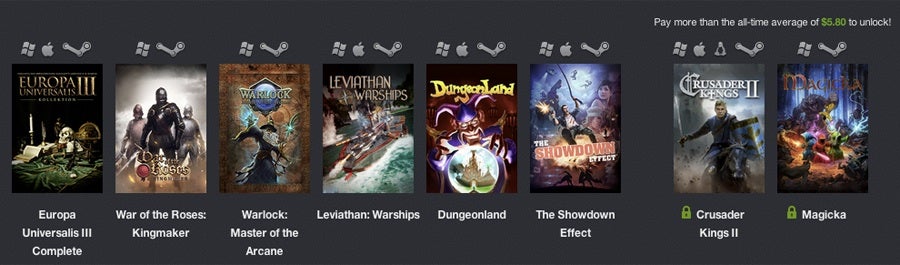 The latest Humble Weekly Bundle comes courtesy of Swedish publisher Paradox. It packs in Europa Universalis 3 Complete, War of the Roses: Kingmaker, Warlock: Master of the Arcane, Leviathan: Warships, Dungeonland and The Showdown Effect, and if you pay more than average you'll also get Crusader Kings 2 and Magicka. Although it has a reputation as a hardcore PC company, a couple of the games are available on Mac, and there's even one Linux title. Pay what you want, but if you fork out $125 or more you'll get 48 games and 20 soundtracks total; quite the bargain.