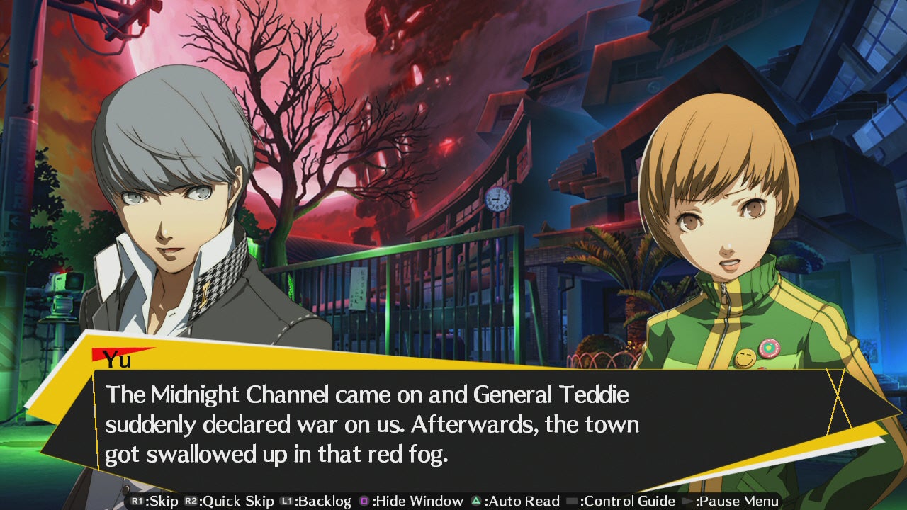 Ultimax continues that plot with the same presentation: visual novel dialog scenes with amazing character art, animated cutscenes, and a story that you peel like an onion. The Persona 4 Investigation Team is enjoying life without The Midnight Channel when their town is engulfed in a red mist. This mist brings with it the tower of Tartarus and all the properties of the Midnight Channel, allowing the team to summon their Personas in the real world. The foe behind the events of the first game is revealed and he's captured the Shadow Operatives (the Persona 3 characters) who helped out in the last mess. It up to Yu Narukami and friends to beat their Shadow shelves and figure out what's going on.