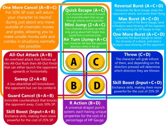 Crazy right? Most of that you can safely ignore, but as you get better and better, it starts to become required to play. Trying to remember if you need to use a Reversal Burst, Quick Escape, or an All-Out Attack in the heat of battle and trying to remember what the button combinations for those moves are is a tall order for a neophyte. Yes, the Dual Shock 3 offloads some of those combinations onto the shoulder buttons, but it's a bit much.