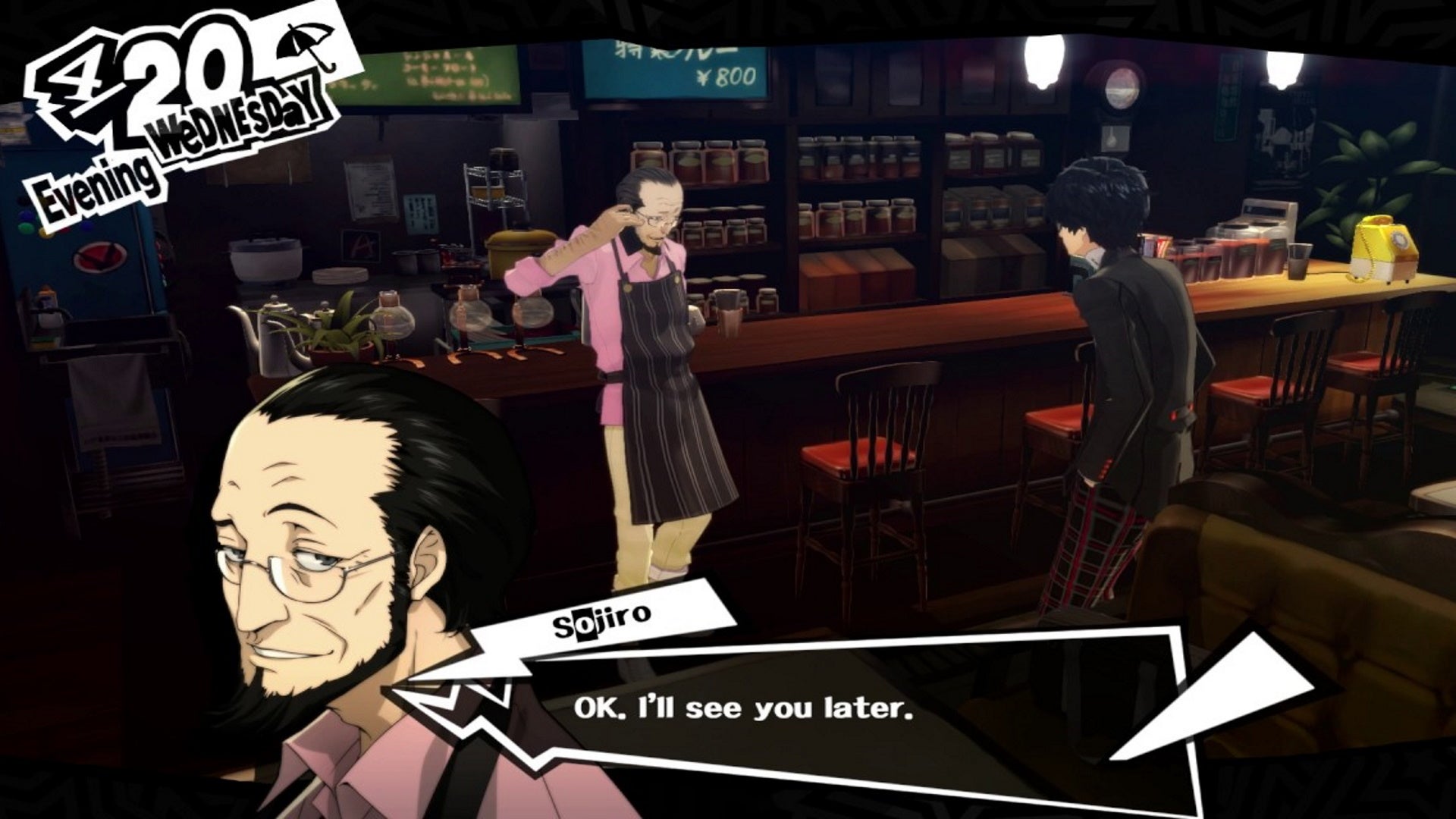 Sojiro is available at night on every day of the week except Tuesday and is available day and night on rainy days. You’ll find him behind the counter at Cafe Leblanc. However, the Sojiro Confidant is locked at rank 4 until the deadline for Futaba’s Palace passes on August 21. Even if you complete the Palace early, you still have to wait for the actual deadline to pass before you can continue with his Confidant.