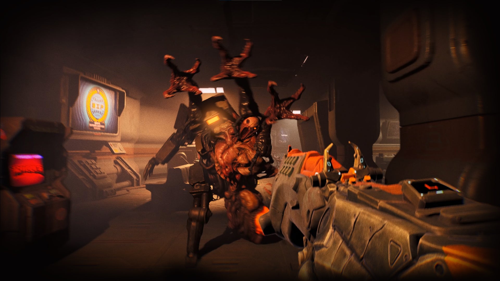 The upside? We get to go back to the hub ship and inspect the gun again. On each run, you can parts for crafting as you explore. The game is part-looter shooter and part-roguelike, with quite a lot of items sticking with you between runs. This means – great news! – you can upgrade your pet and make it even more powerful, even faster, even better. Maybe even cuter (if you find horror from the likes of Alien, The Fly, and The Thing cute, that is).