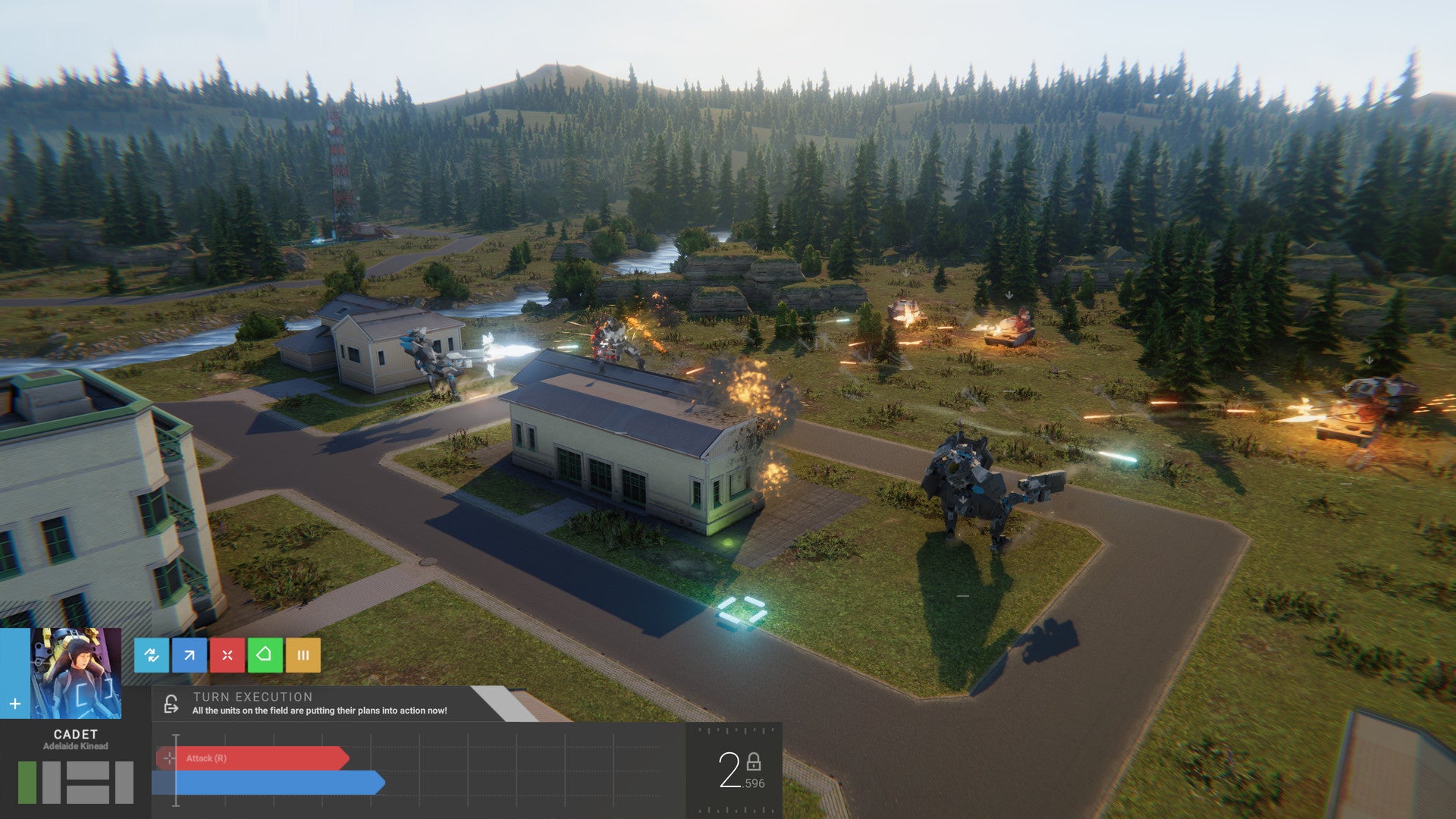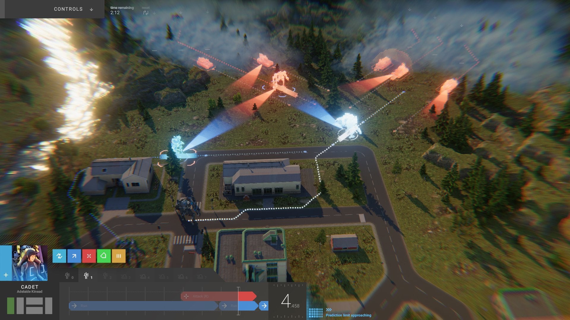 Then, like you're crafting a video in Adobe Premiere, you drop your squad's actions onto the same timeline. Depending on their capabilities, your mechs can attack, run, defend, or simply wait. Certain actions can be used together, like attacking in one direction while moving in another. Attack actions have a set duration, so shooting with an assault rifle can take around two seconds, while moving and wait time can be as long as you want. Together, you can create complex move chains; imagine telling one mech to stay behind a building for 1 second for cover, then to fire down a street while retreating.