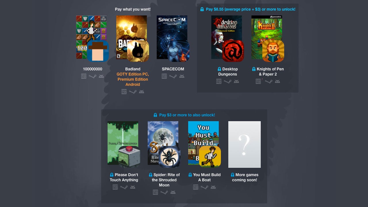There are soundtracks at every tier, and most games have Linux and Mac builds available. As mentioned above these are all DRM free, but as long as you pay over $1 you can opt for Steam keys.