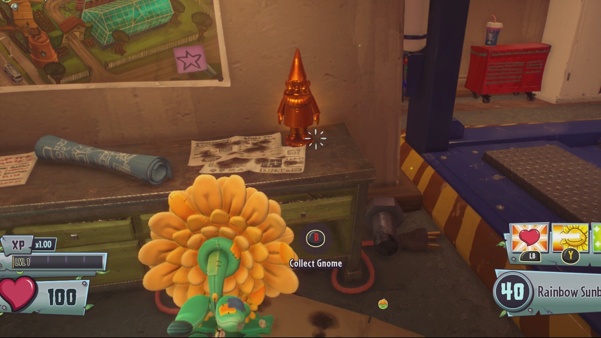 A few Gold Gnomes are in hard to reach locations, so we recommend using either Super Brains or the Peashooter to search for gnomes. Both of these characters have abilities that allow them to jump high enough to reach rooftops and other tall structures where some Gold Gnomes are found.