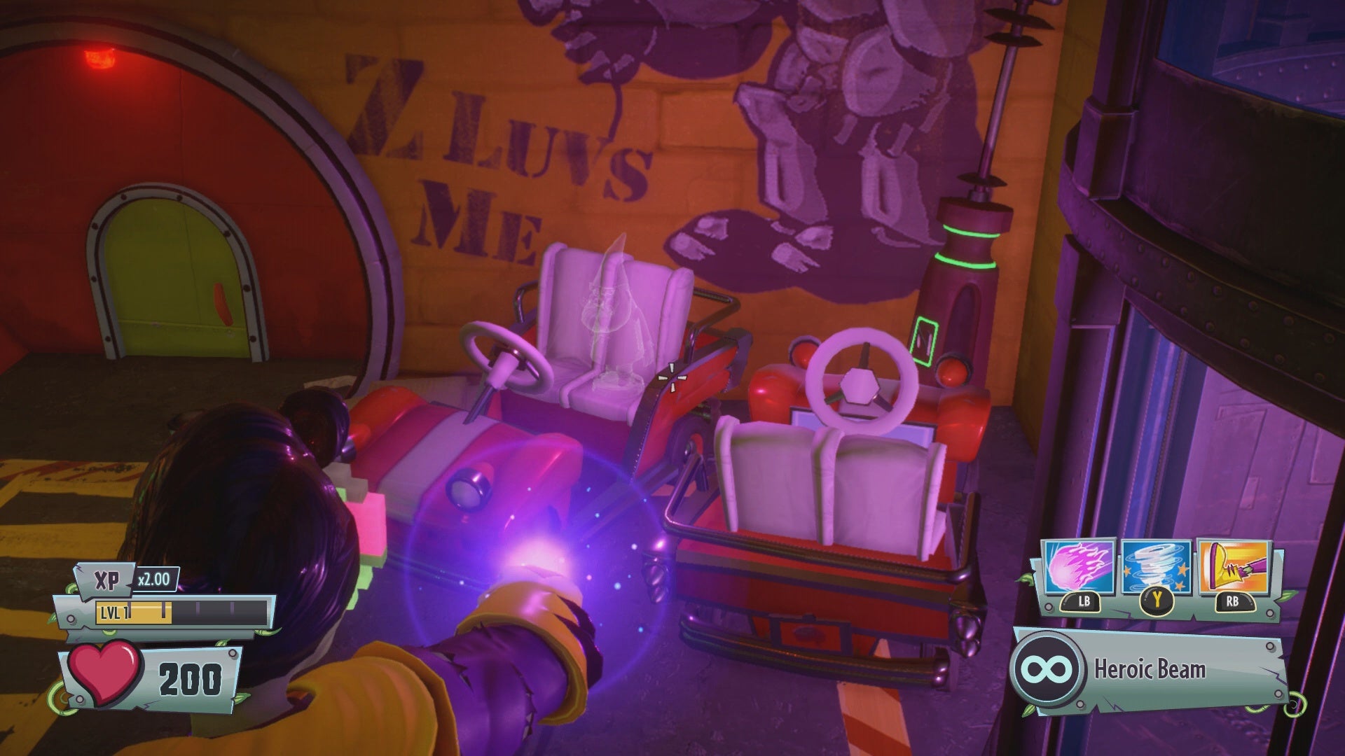 Gold Gnome #12 - Enter the Hero Portal for the Imp and Z-Mech. A Gold Gnome is sitting in the car seat of a small red car along the right wall.